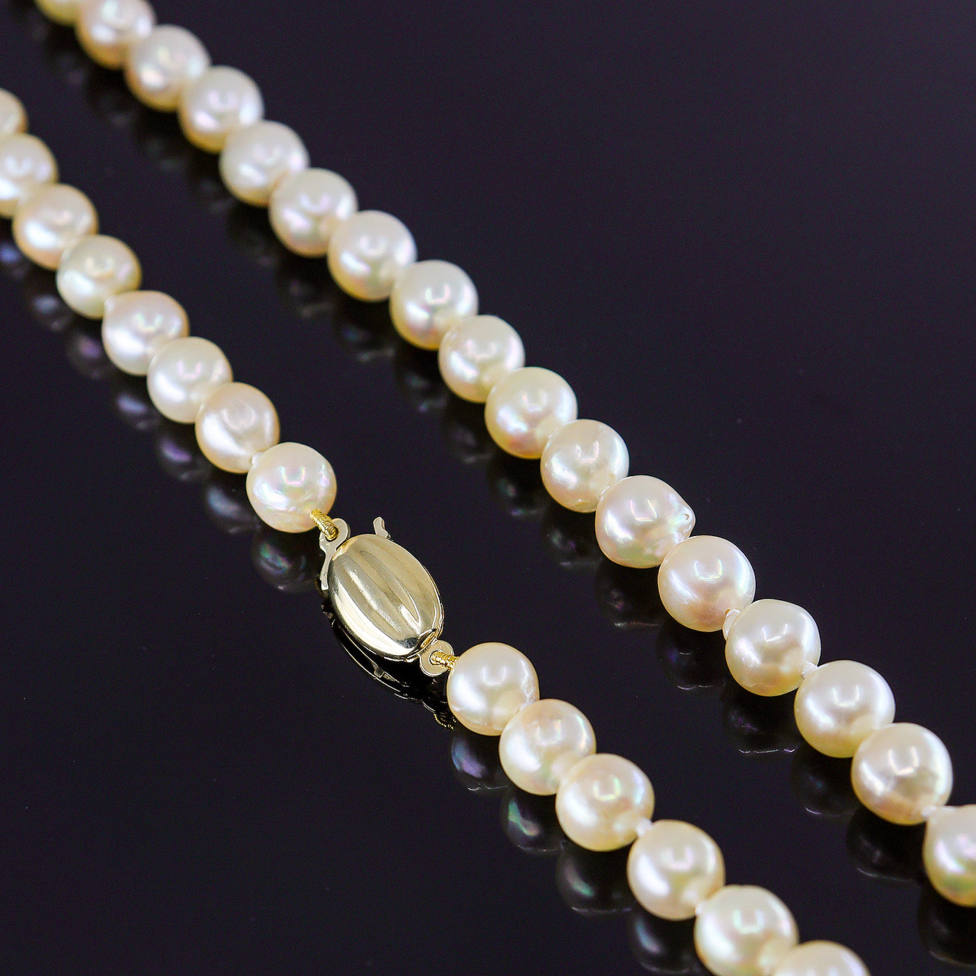A row of Cultured Pearls with a slight natural variation which enhances the unique charm and character of this elegant piece. Beautifully hand knotted between each pearl, the necklace is finished with a ribbed 9ct Yellow Gold oval polished clasp, adding a refined touch of luxury and classic style.
