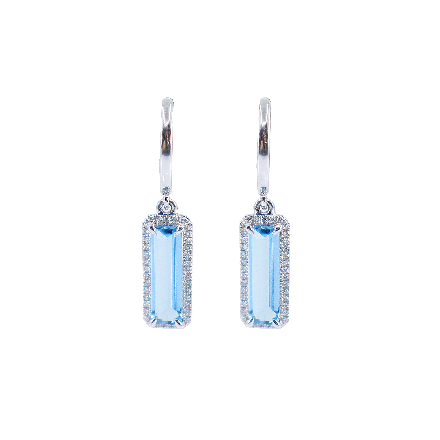 Vibrant and elegant, these striking Swiss Blue Topaz and Diamond drop earrings are set in 9ct White Gold. Each earring features a beautifully cut rectangular Swiss Blue Topaz and enhanced by the sparkle of Round Brilliant Cut Diamonds. The drop is suspended from a secure huggie hoop fitting, offering both comfort and contemporary style.