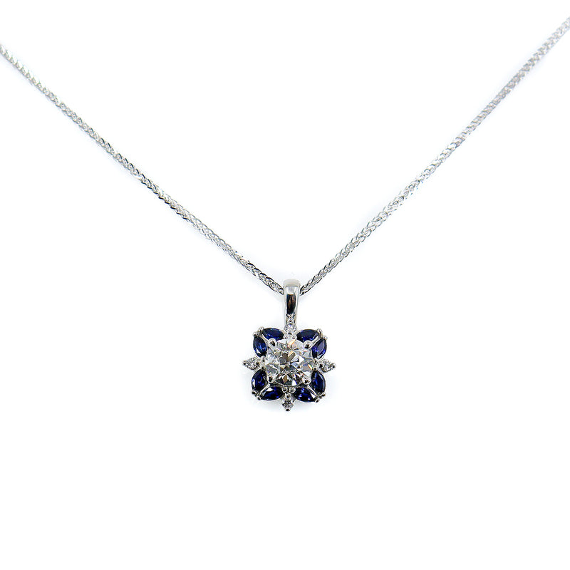 Pre-Owned Platinum Old Cut Diamond & Marquise Sapphire Flower Pendant on 18" Spiga Chain