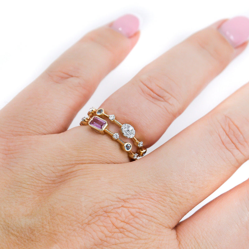 9ct Yellow Gold Diamond, Pink Sapphire & Blue Topaz Two Row Multi Stone Ring