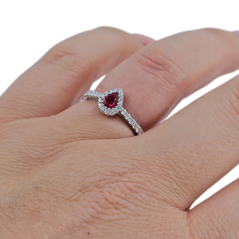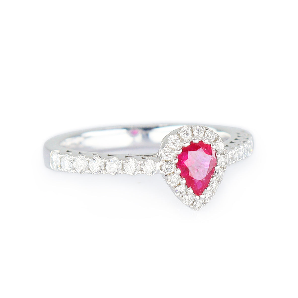 18ct White Gold Ruby and Diamond Pear Shaped Halo Ring