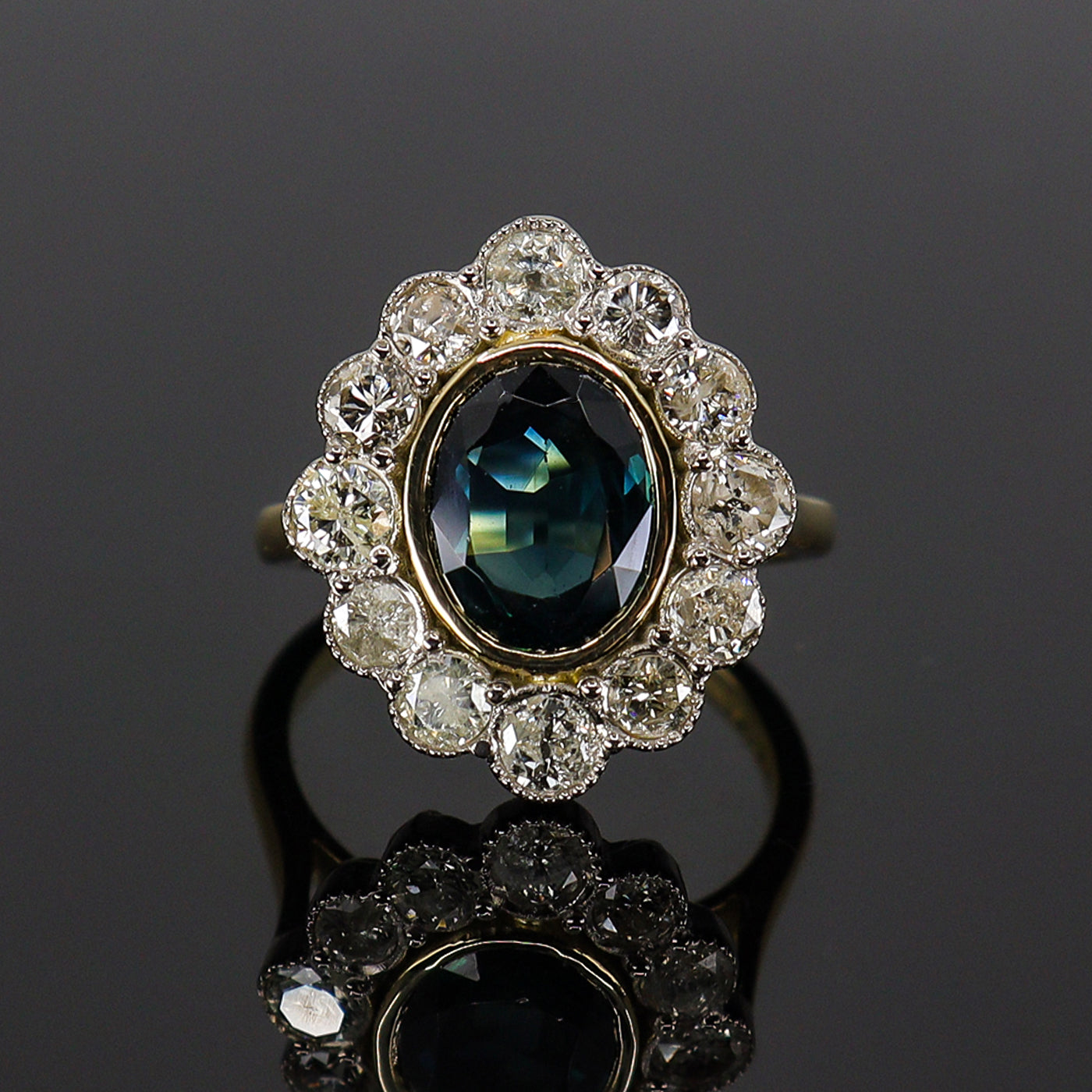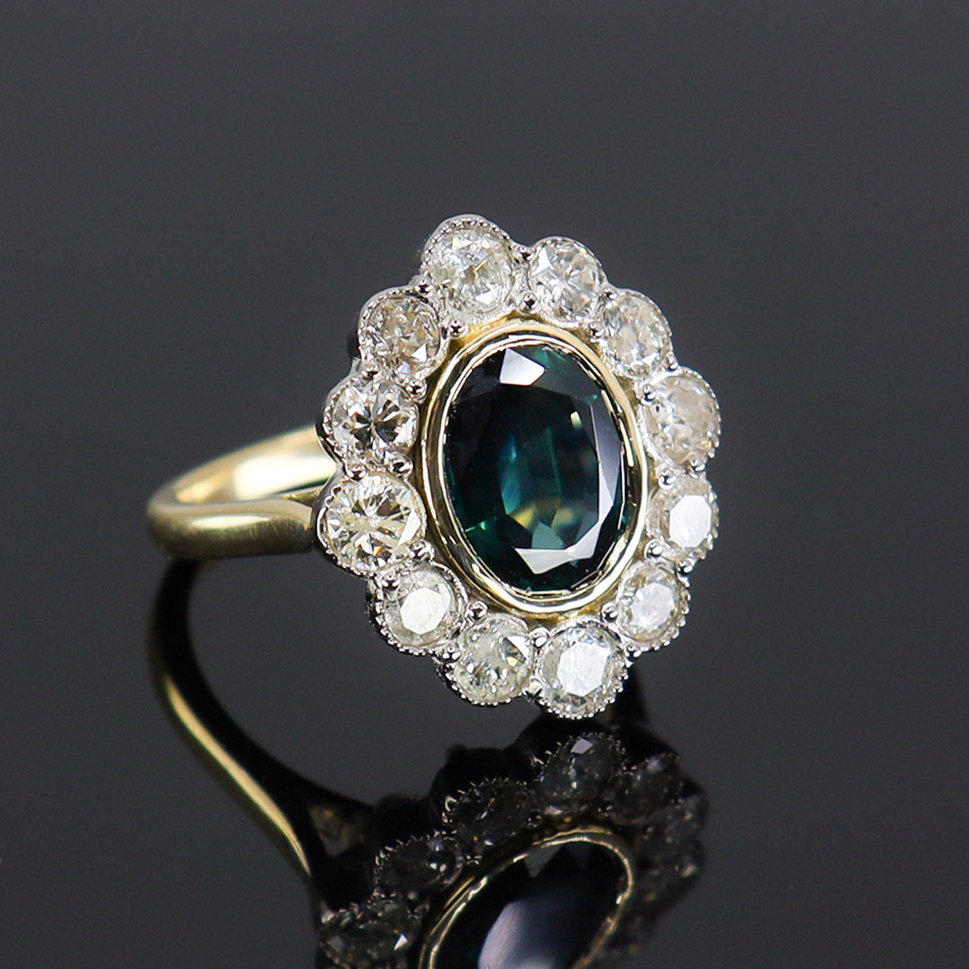 This exquisite cluster ring showcases a striking oval Teal Sapphire in a secure rub-over setting, surrounded by 12 round diamonds. The diamonds are beautifully framed with a delicate beaded edge, enhancing the sparkle and adding vintage-inspired charm to the design.