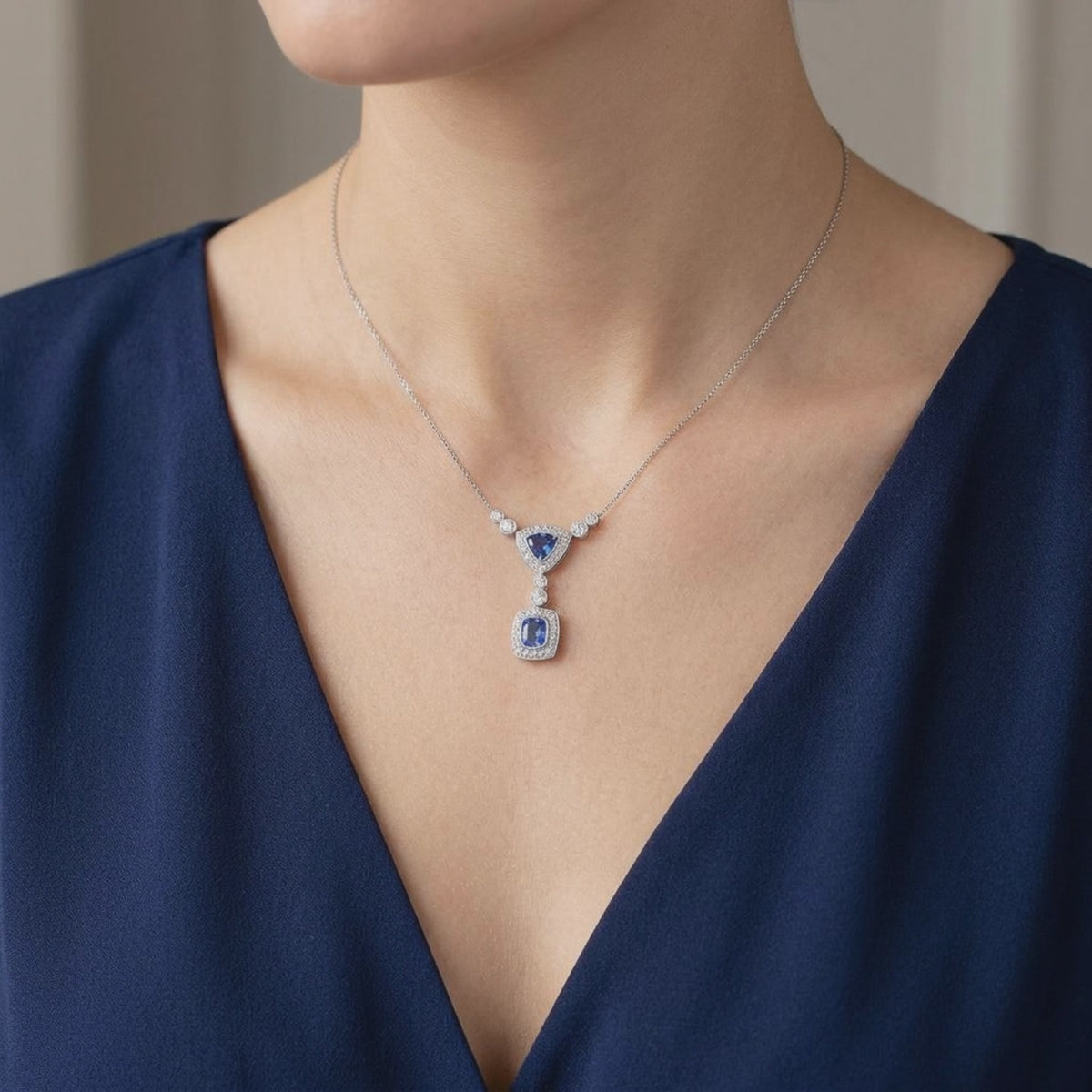 Vivid blue sapphires take centre stage of this Art Deco inspired pendant. Contrasting rub set trillion and cushion cut sapphires are surrounded in grain set diamond halo, creating a dazzling look.. gemstone cuts add interest to this This exquisite Sapphire and Diamond pendant showcases a variety of cuts in a rub over setting and is crafted in 14ct White Gold. This pendant floats on a pretty trace chain.