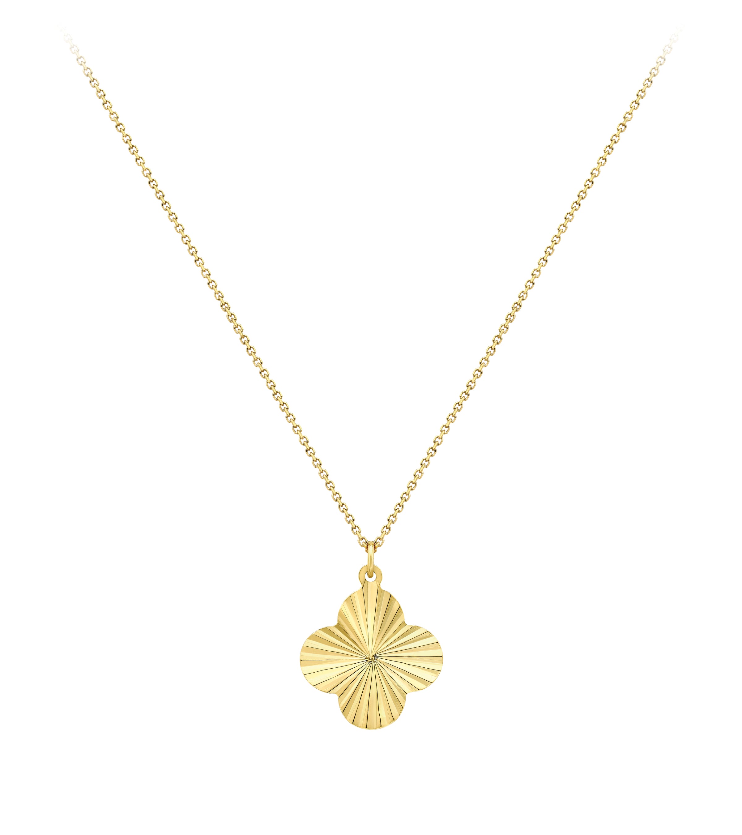 Elegant and timeless, this gold clover pendant necklace features a sunray diamond cut design that catches the light is suspended from a delicate chain. The radiant gold finish adds a touch of sophistication, making it the perfect piece to wear alone or layered with other necklaces. A symbol of luck and grace, this pendant brings effortless charm to any look.