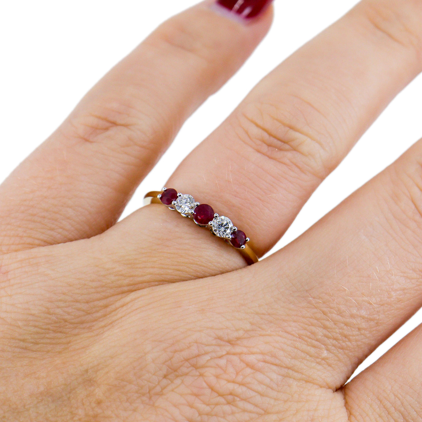 A beautiful 18ct Gold eternity ring, set with three rich red Rubies and two sparkling round brilliant cut Diamonds in an elegant five-stone claw setting. The alternating gemstones create a timeless design, symbolising love and devotion. Perfect as an anniversary ring, a special gift, or a stunning addition to any jewellery collection.