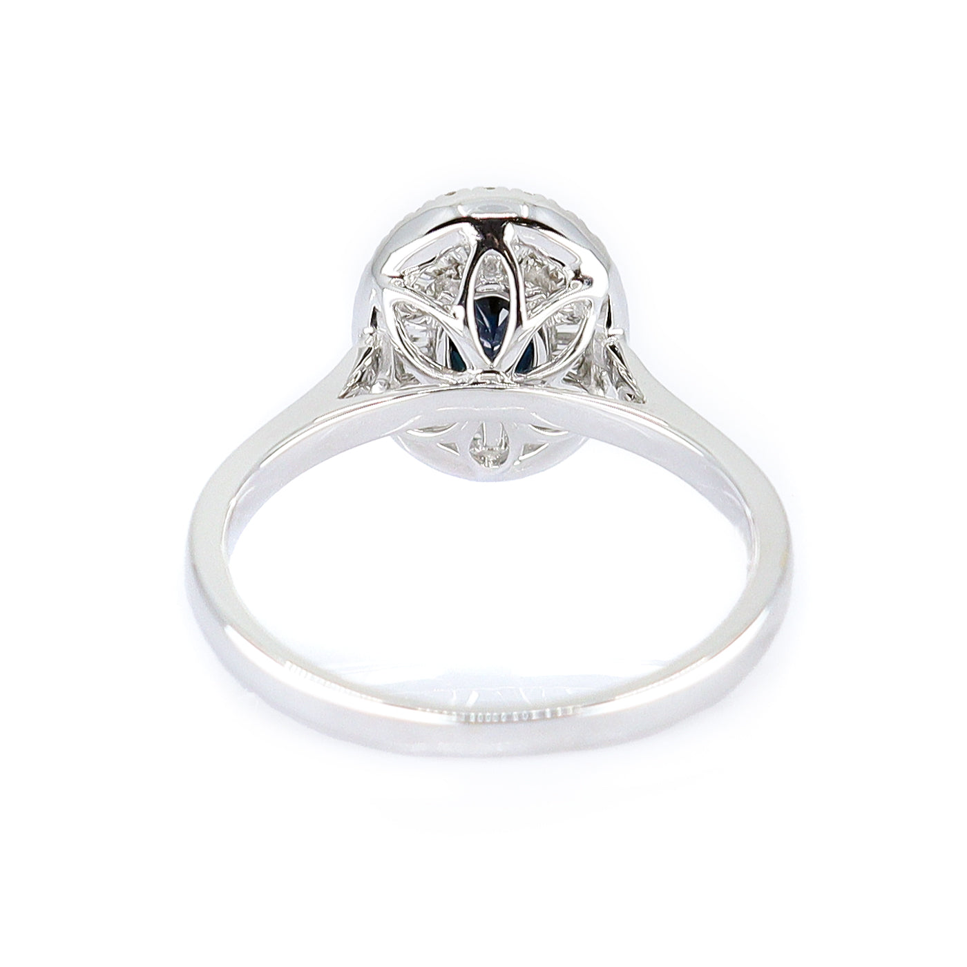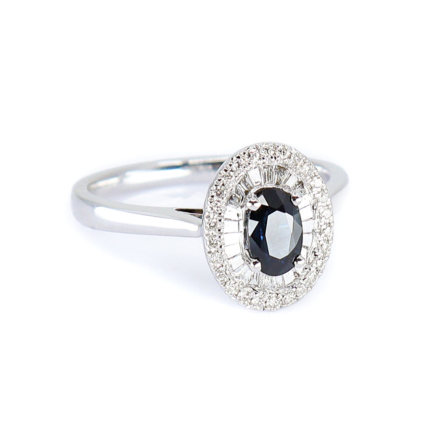 18ct White Gold Oval Sapphire & Diamond Tapered Baguette & Round Brilliant Double Halo Cluster Ring