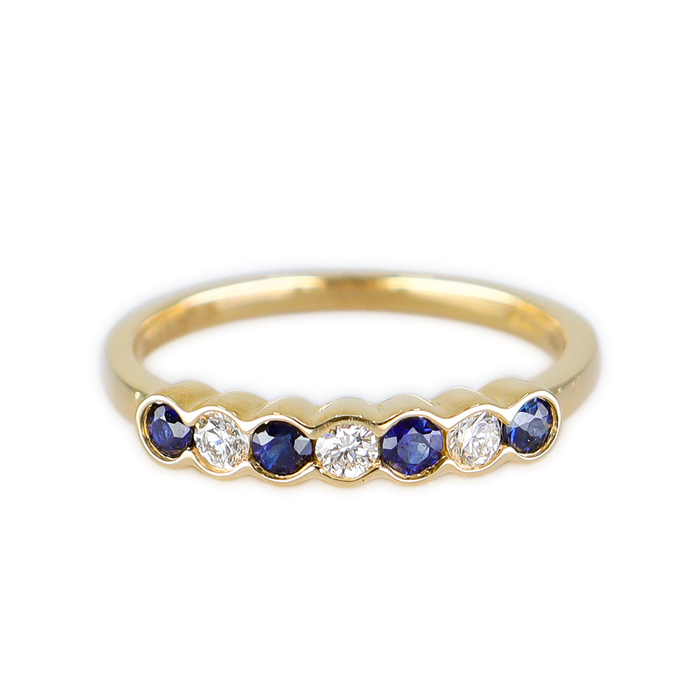 A stunning 18ct Yellow Gold eternity ring featuring four round Sapphires and three round brilliant cut Diamonds, each securely rub set within a smooth channel setting. The alternating Sapphires and Diamonds create a timeless and elegant design, perfect as a symbol of everlasting love or a luxurious stacking ring.