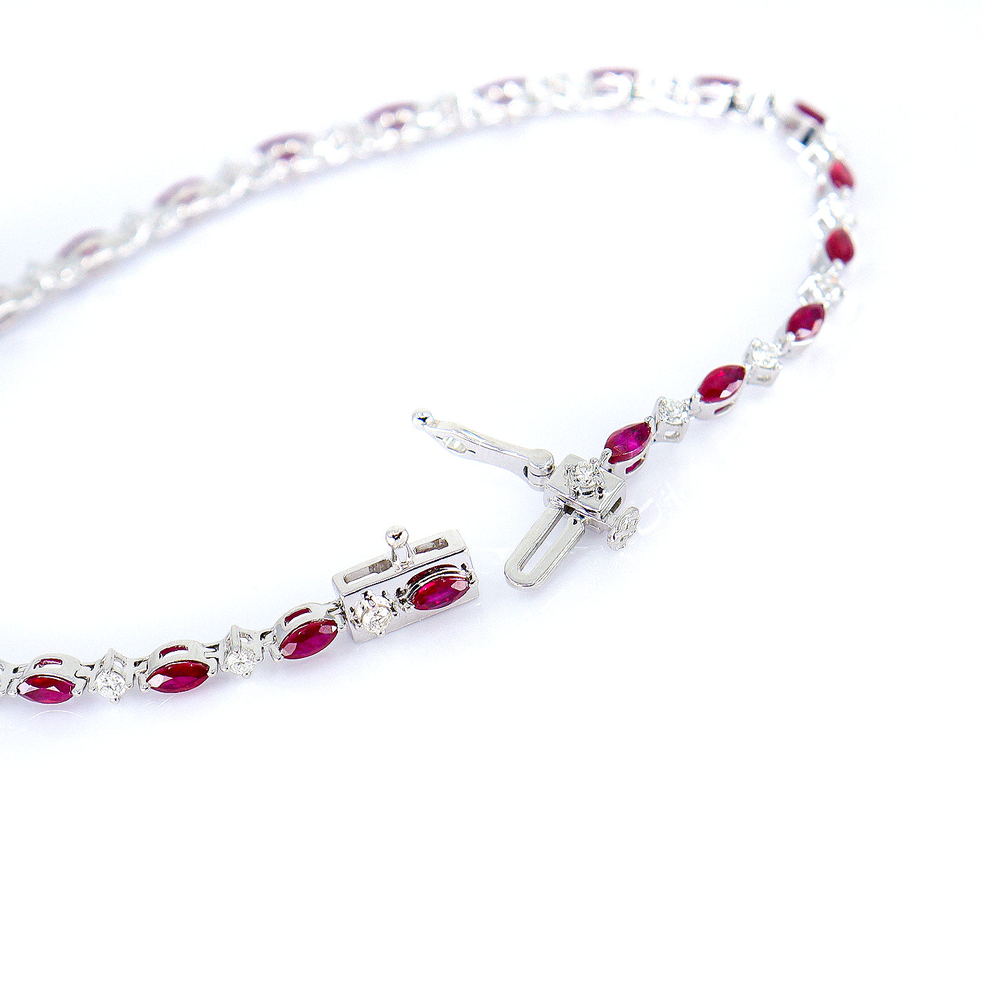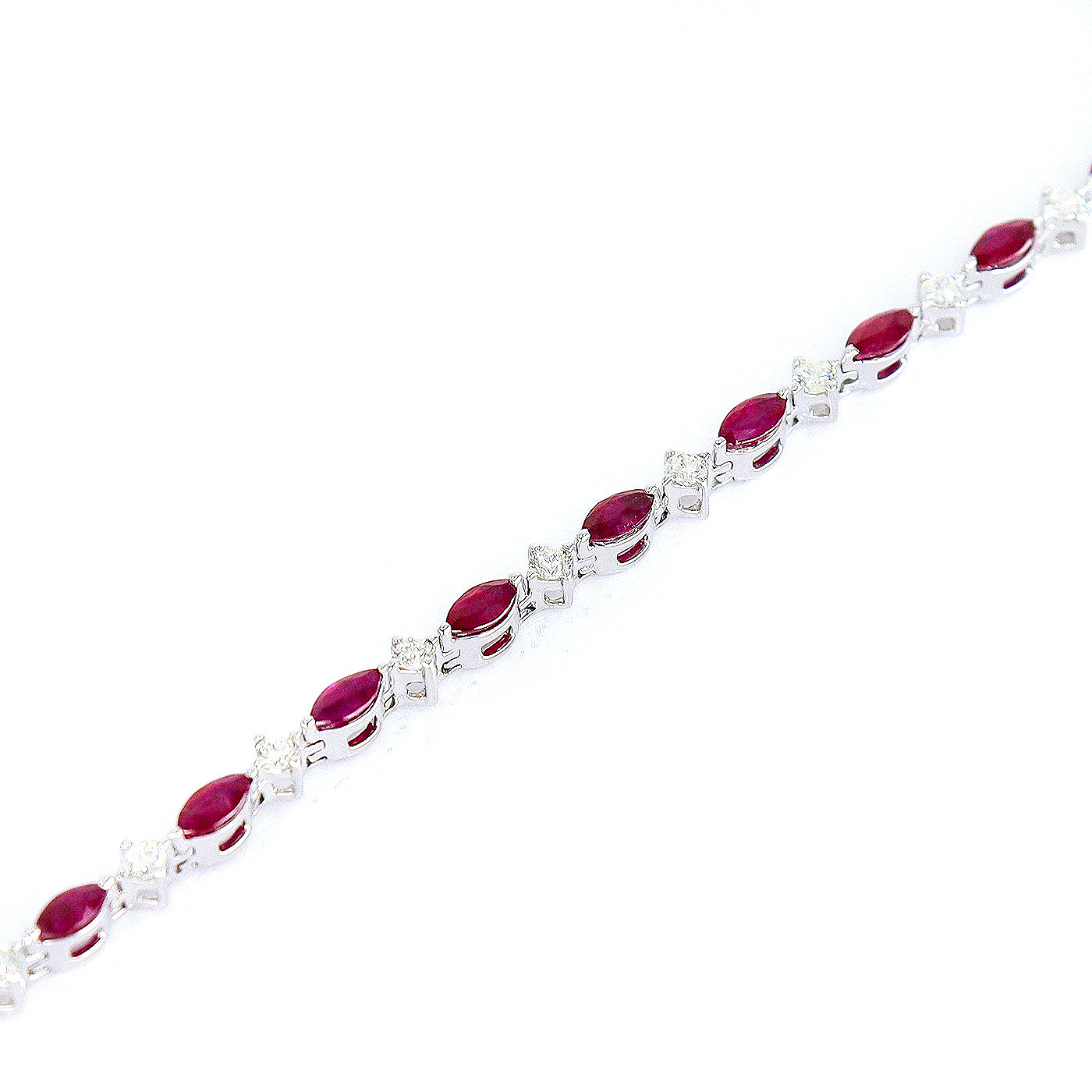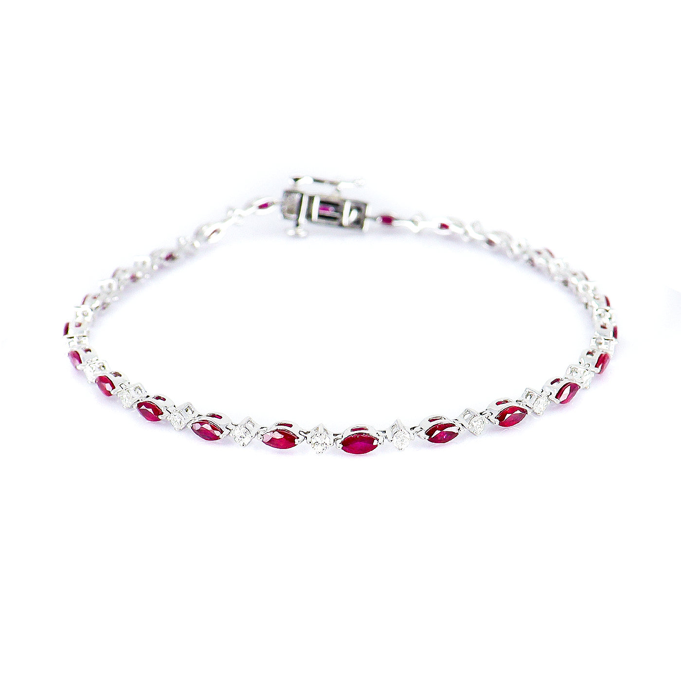 A stunning 9ct White Gold line bracelet featuring alternating marquise-cut Rubies and round brilliant cut Diamonds, all beautifully secured in claw settings. The bracelet is finished with a box clasp and figure-eight safety clasp for secure and comfortable wear.