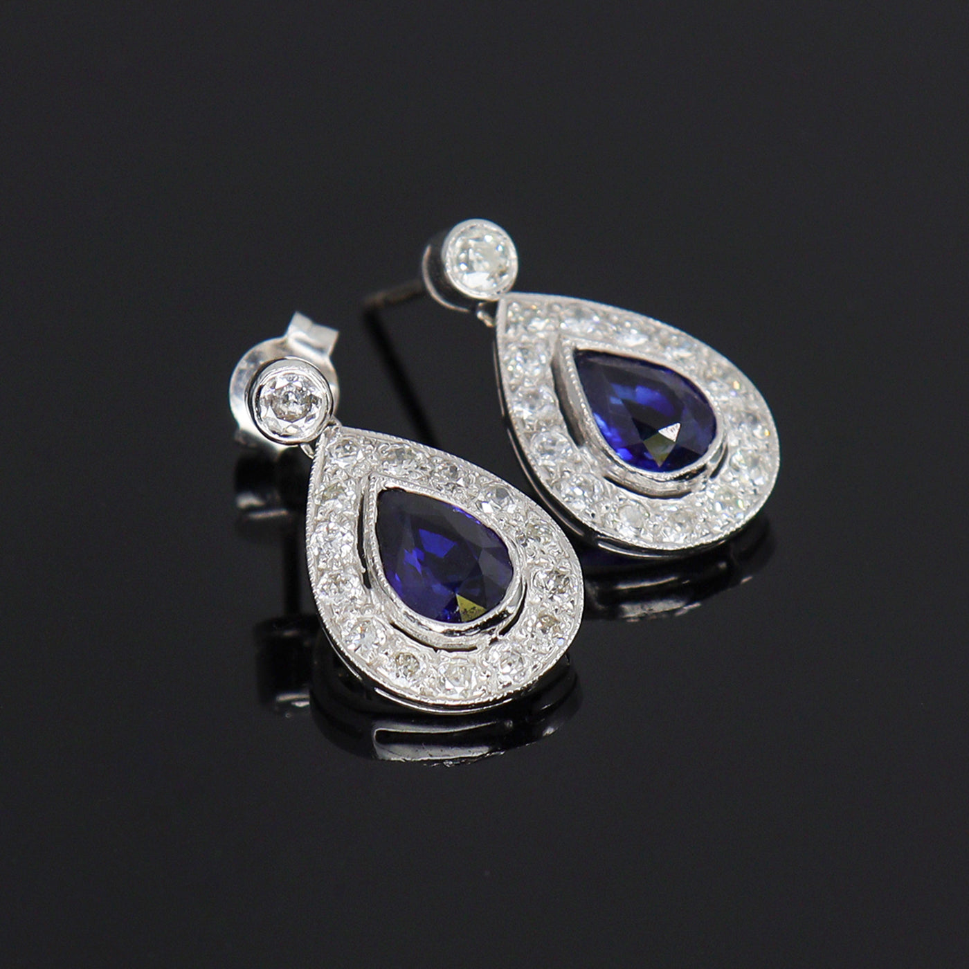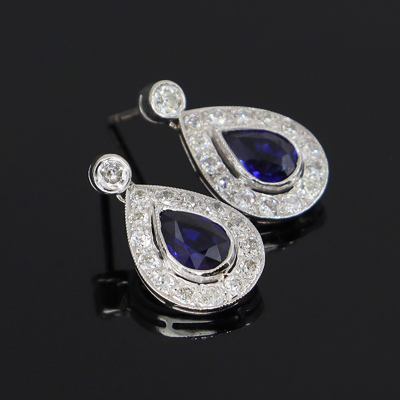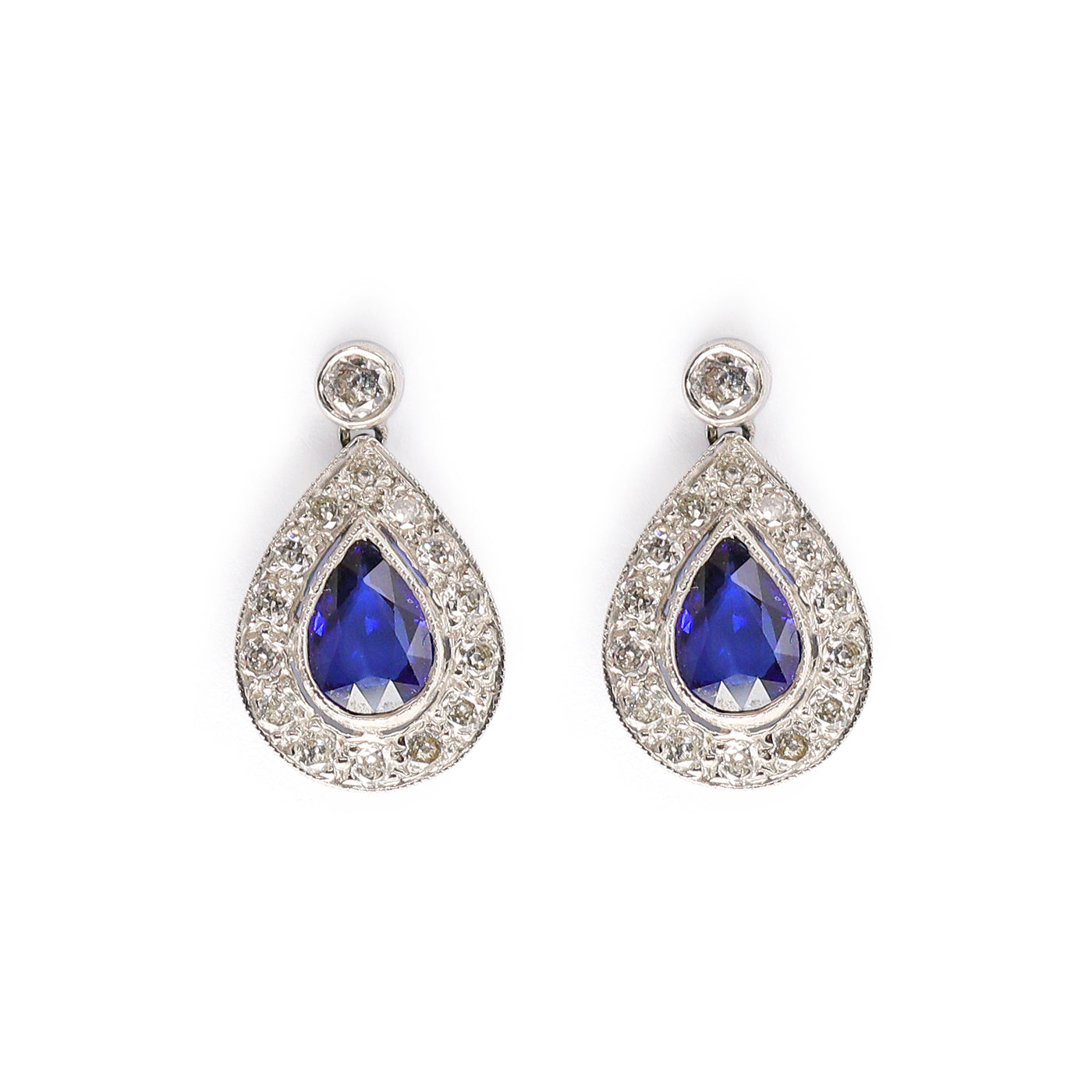 Discover Chatfields hand-selected Pre-Owned collection of exquisite jewellery. Timeless elegance with these exquisite pear-shaped drop earrings. Each earring showcases a deep blue Sapphire in the centre, beautifully framed by shimmering halo of round-cut Diamonds. Set in polished 18ct White Gold, the teardrop design adds a graceful, classic touch—perfect for formal occaisions or adding refined sparkle to your everyday look. The cool tones of the sapphire and 18ct white gold make them a versatile accessory whether for a special occaision or a night out. Each earring features a pear cut Sapphire surrounded 14 round brilliant cut Diamonds in a grain setting, adding a vintage charm to the design. The earrings dangle beautifully from a rub set diamond, with a post and butterfly scroll fitting.