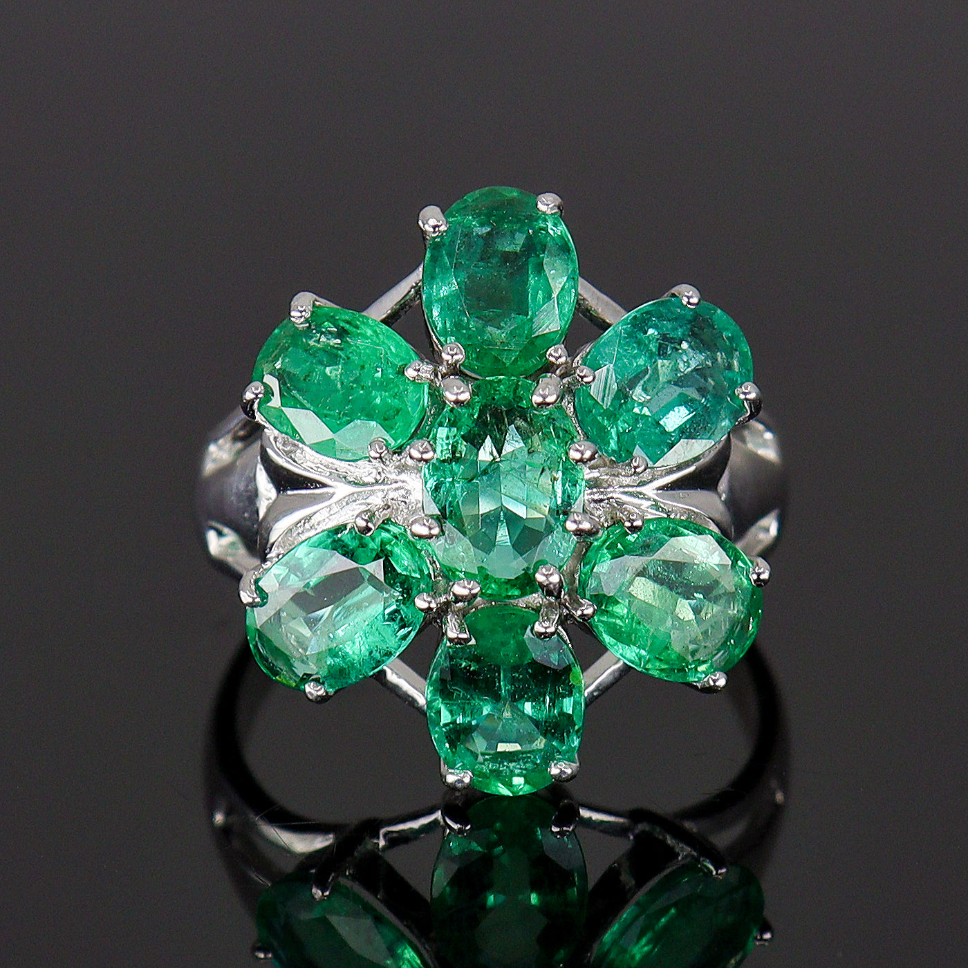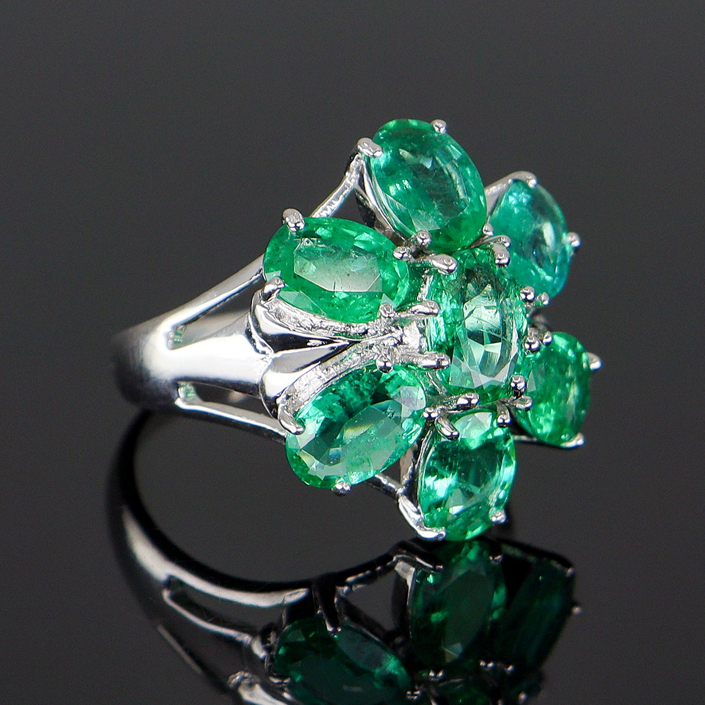 Elevate your elegance with this breathtaking emerald statement ring, featuring a radiant cluster of seven vibrant, oval-cut green gemstones arranged in a sophisticated floral design. Each stone is expertly set in a high-polish silver-tone band that enhances the brilliance and depth of the emerald-green hues. Perfect for formal occasions or adding a bold touch to everyday style, this ring captures light beautifully and offers a luxurious, eye-catching sparkle from every angle. A true centerpiece accessory, it embodies both timeless charm and modern glamour.