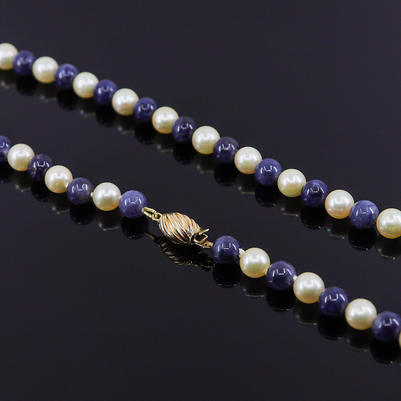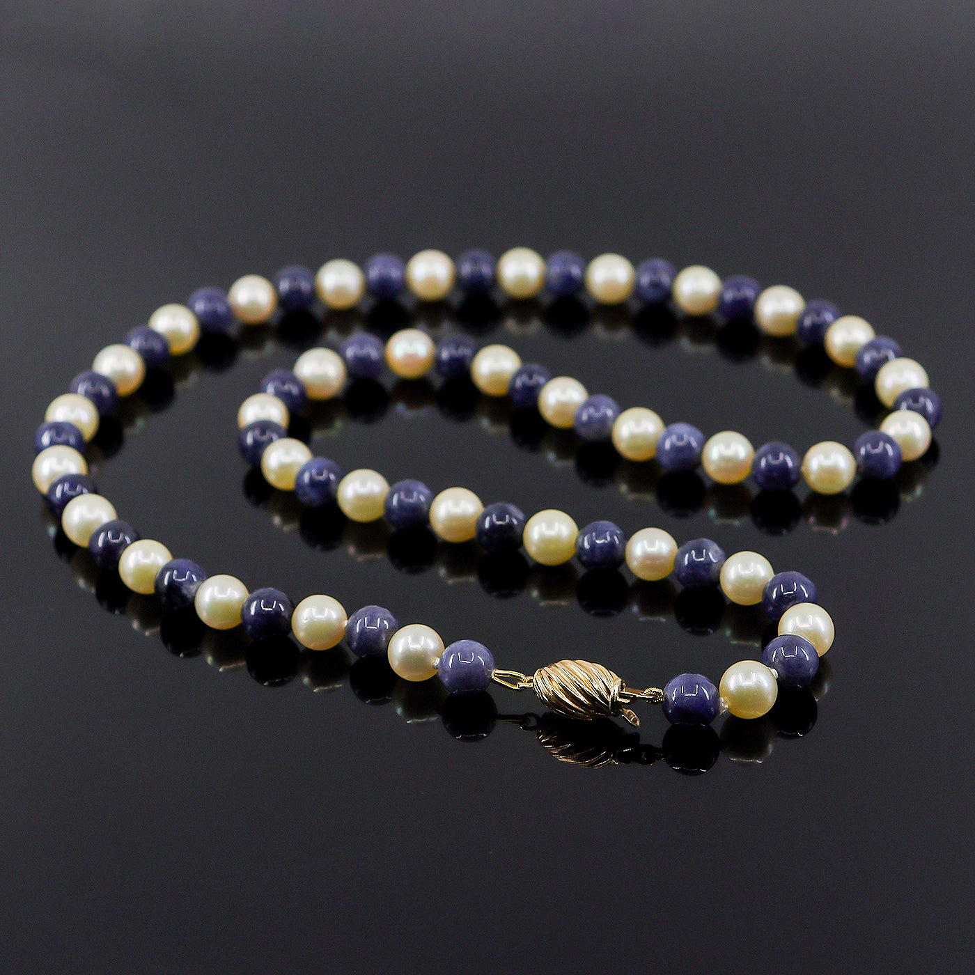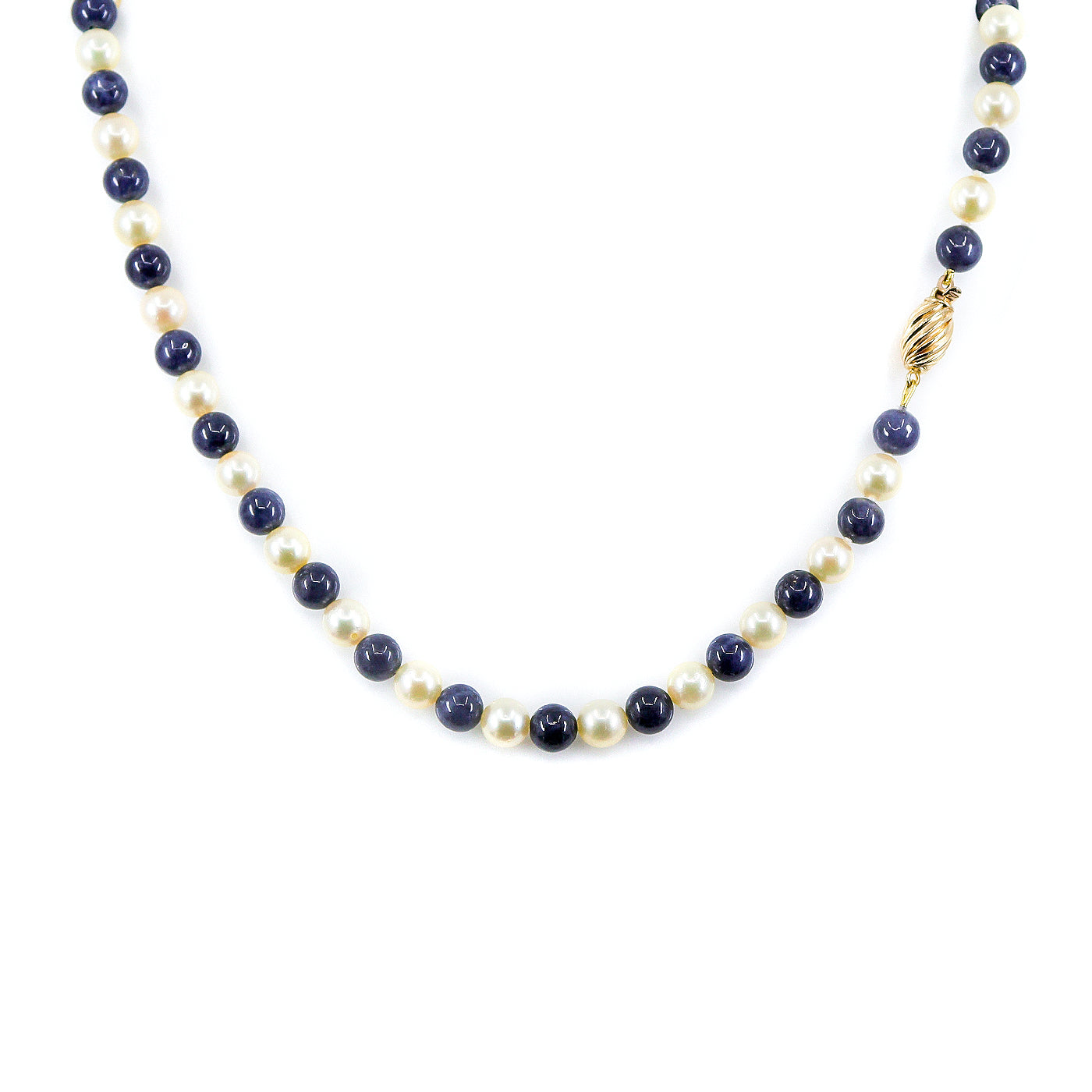 Pre-Owned Alternating Cultured Pearl & Sapphire Bead Necklace with 9ct Yellow Gold Oval Fluted Clasp