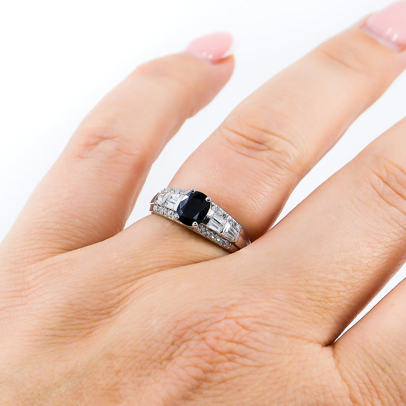 18ct White Gold Oval Sapphire & Diamond Tapered Baguette & Round Brilliant Double Halo Cluster Ring