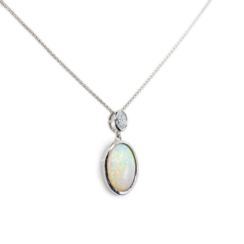 Pre-Owned 18ct White Gold Opal & Diamond Rub Set Pendant & Chain