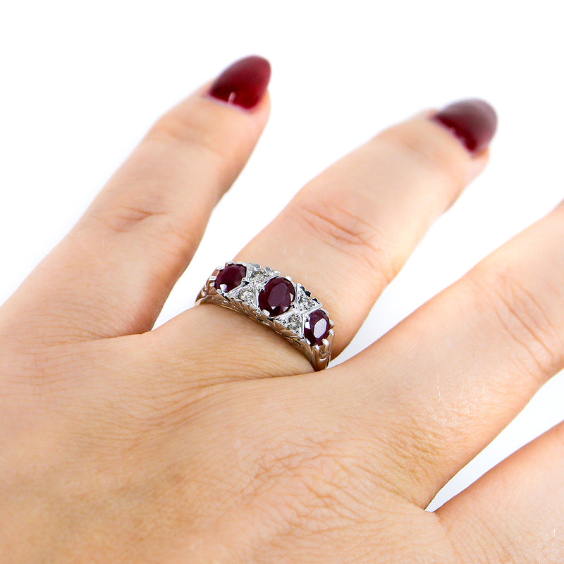 Pre-Owned 9ct Yellow Gold Graduated Oval Ruby & Diamond Vintage Style Trilogy Ring
