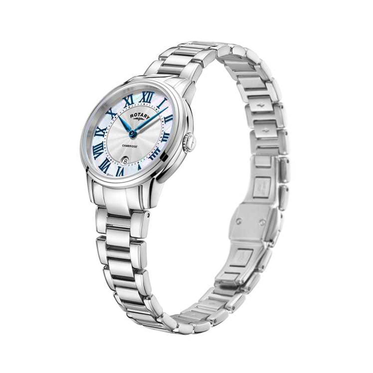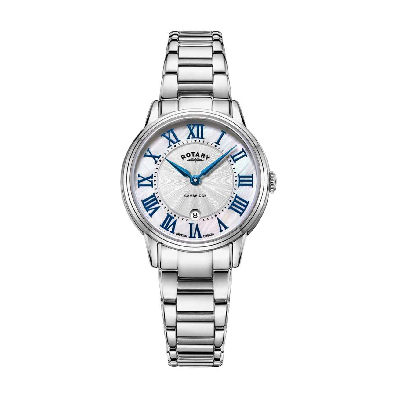 Timeless and sophisticated, this fashionable ladies Dress timepiece is characterised by a white mother of pearl outer dial with blue roman numeral hour markers and a guilloche inner dial. Powered by a quartz battery, it features a 30mm stainless steel case with date functionality and is water resistant up to 50m.