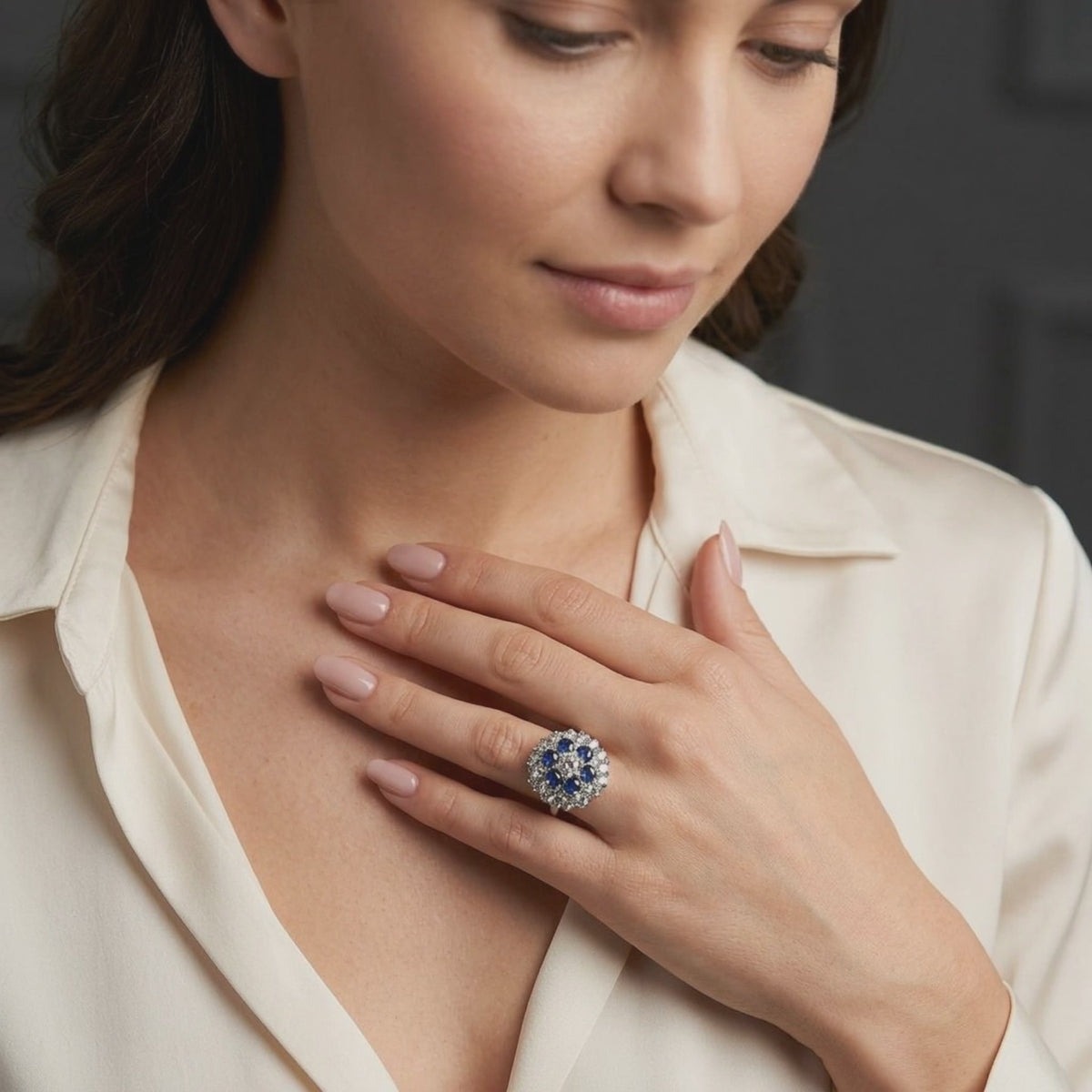 This exquisite mid-century inspired, flower-patterned, cluster ring is crafted in 18ct white gold . A graduated border of sparkling Diamonds surround six vivid Blue Sapphires that form the petals, with a Round Brilliant Cut Solitaire at its centre. This ring beautifully combines bold colour and timeless sparkle, making it a striking statement piece for any occasion.