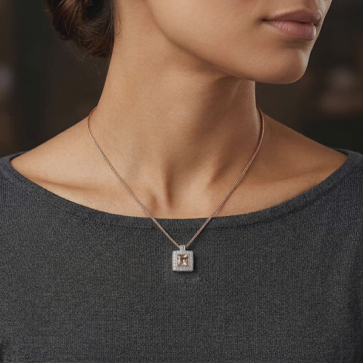 A romantic square Pink Tourmaline surrounded by round brilliant cut Diamonds and topped with an Emerald Cut Diamond pendant bail, hangs beautifully from an 18ct Rose Gold wheat link chain.