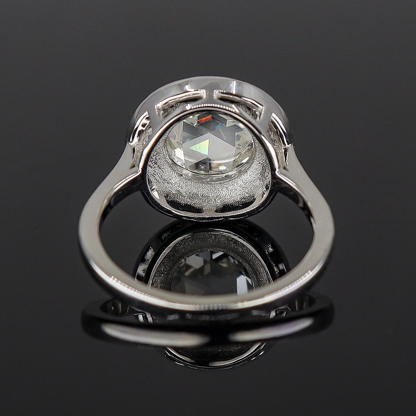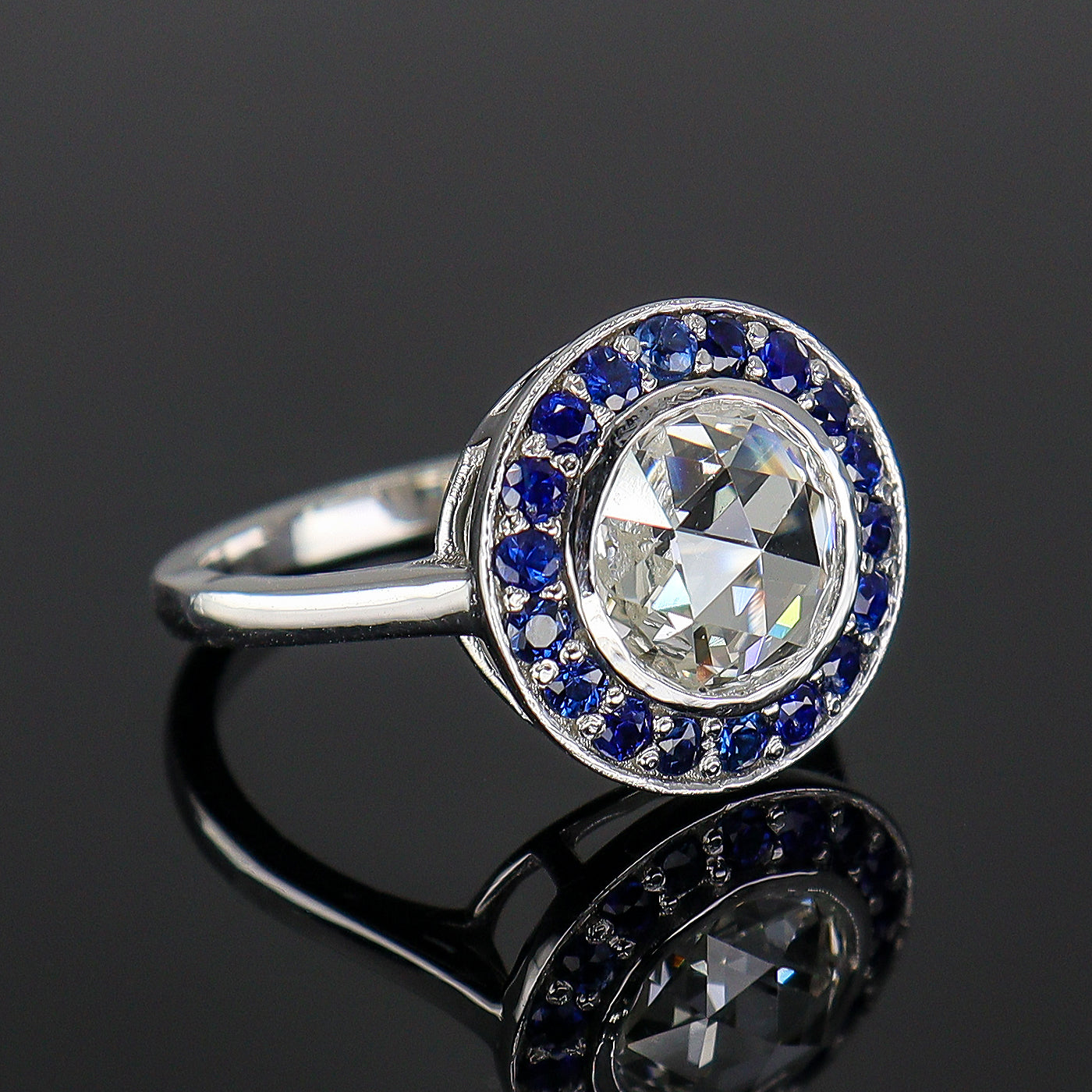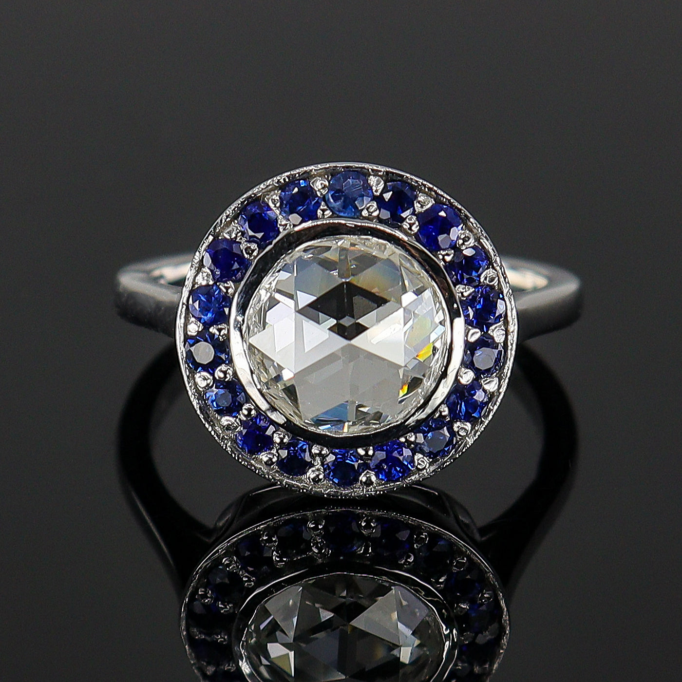 This Platinum ring features a Rose Cut Diamond at the centre with multiple facets that reflect the light beautifully. Surrounding the diamond is a halo of evenly spaced Sapphires that add a rich contrast. The band itself is simple and polished, drawing the eye to the centre sparkling detail. This ring has a classic, elegant style with a bold central focus.