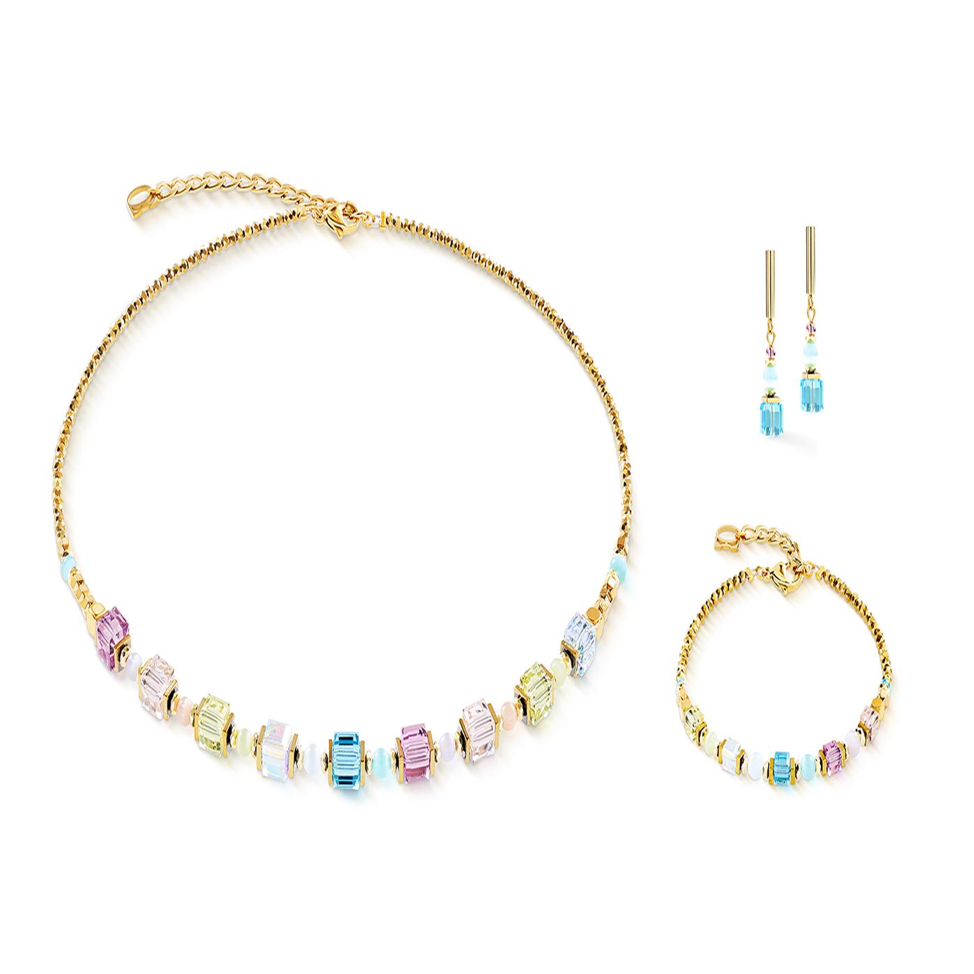 Soft pastel shades meet refined geometry in the Cube Aura pastel gold necklace. Precisely crystal cubes are arranged in a rhythmic sequence, while delicate beads placed in between add a subtle, flowing softness.
