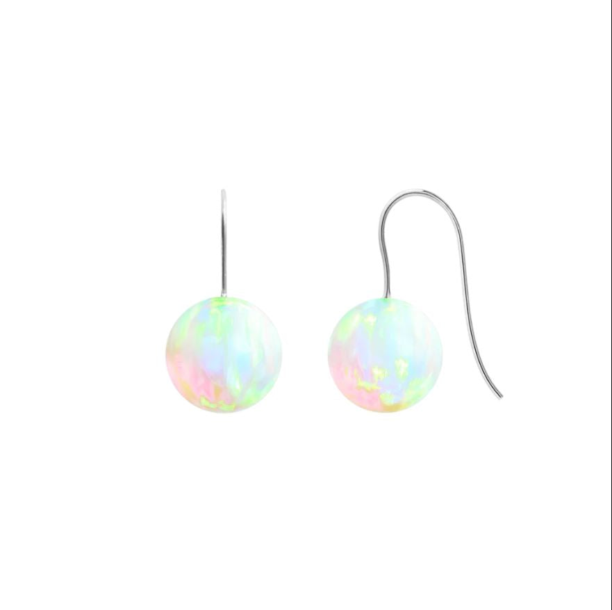 Iridescent lab-grown sea opal drop earrings on a easy to wear hookwire fitting. Gorgeous flashes of blues and greens can be seen when the earrings rotate.