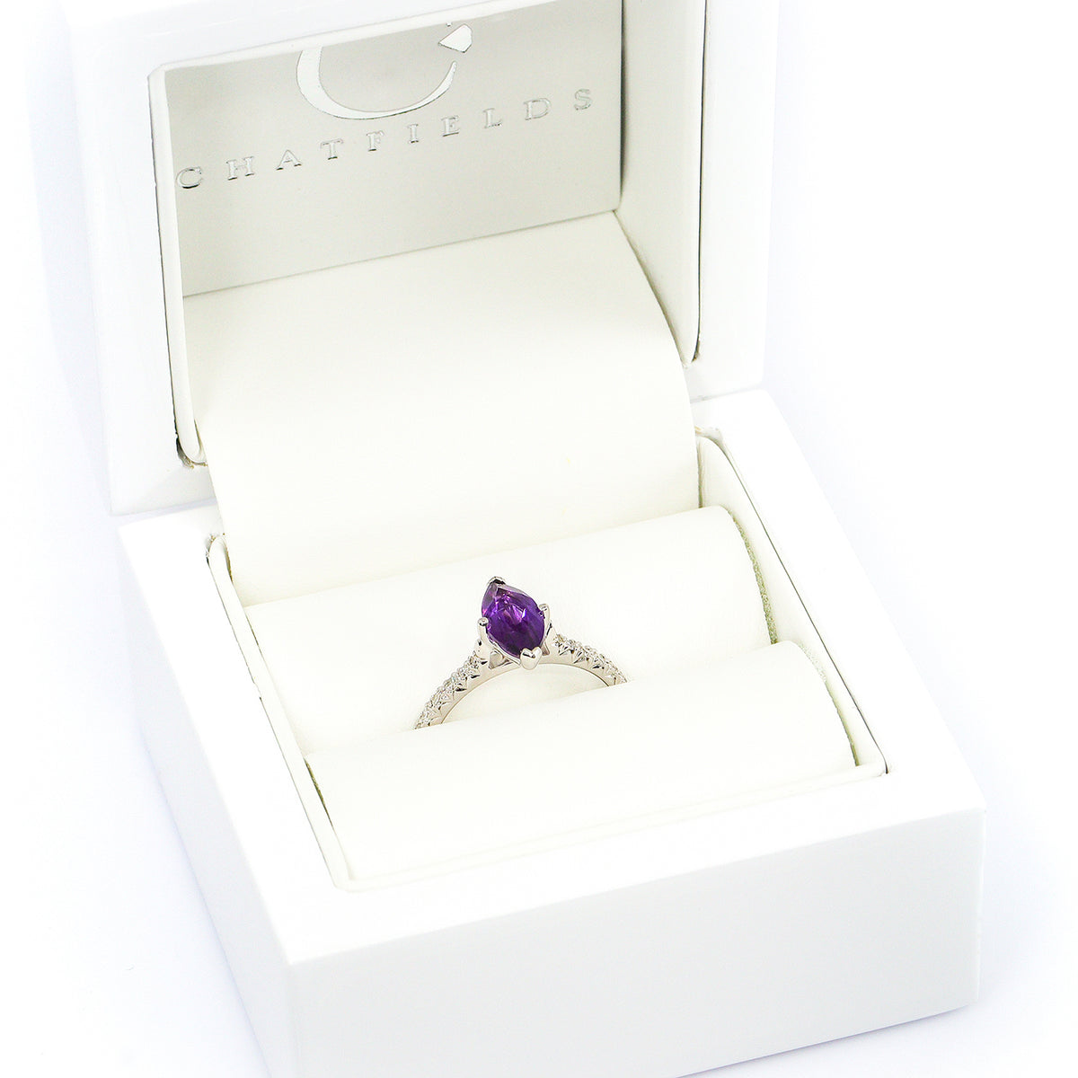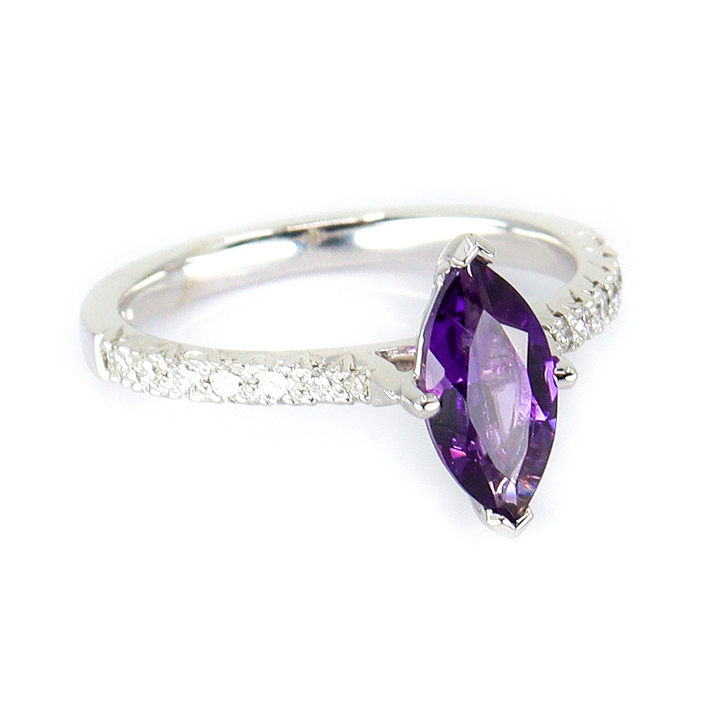 This beautiful ring was inspired by a pair of Marquise Amethyst earrings, this customer fell in love with their rich purple colour. We matched the colour and shape of the Amethyst with the earrings and complimented the stunning Marquise centre stone with elegant graduated Natural Diamond accent shoulders.