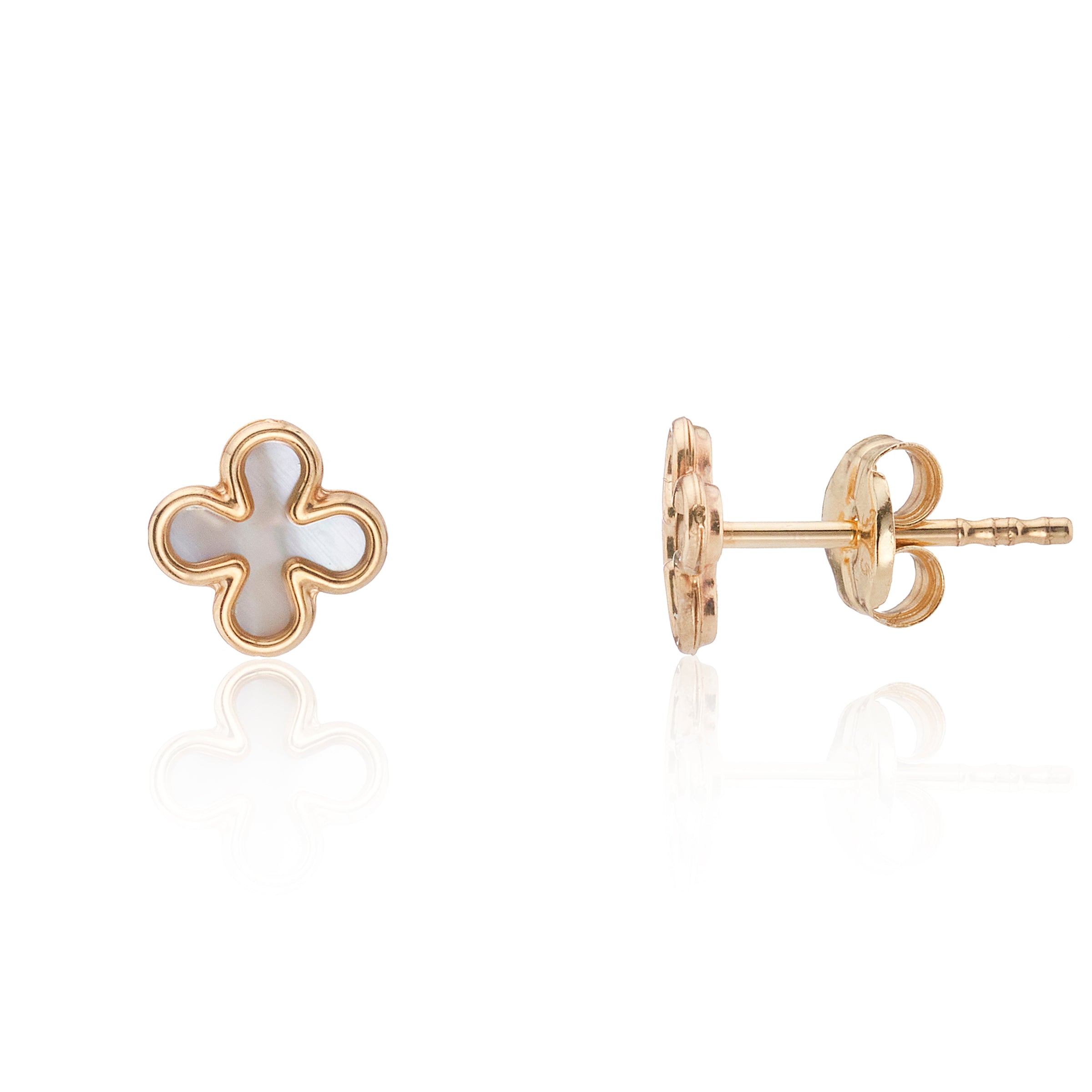 Elegant and contemporary style, these 9ct Yellow Gold petite Mother of Pearl flower stud earrings have a rubover polished setting.