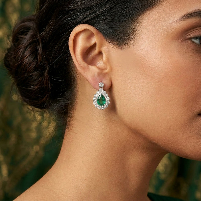 Pre-Owned 14ct White Gold Emerlad & Diamond Pear Shape Cluster Drop Earrings