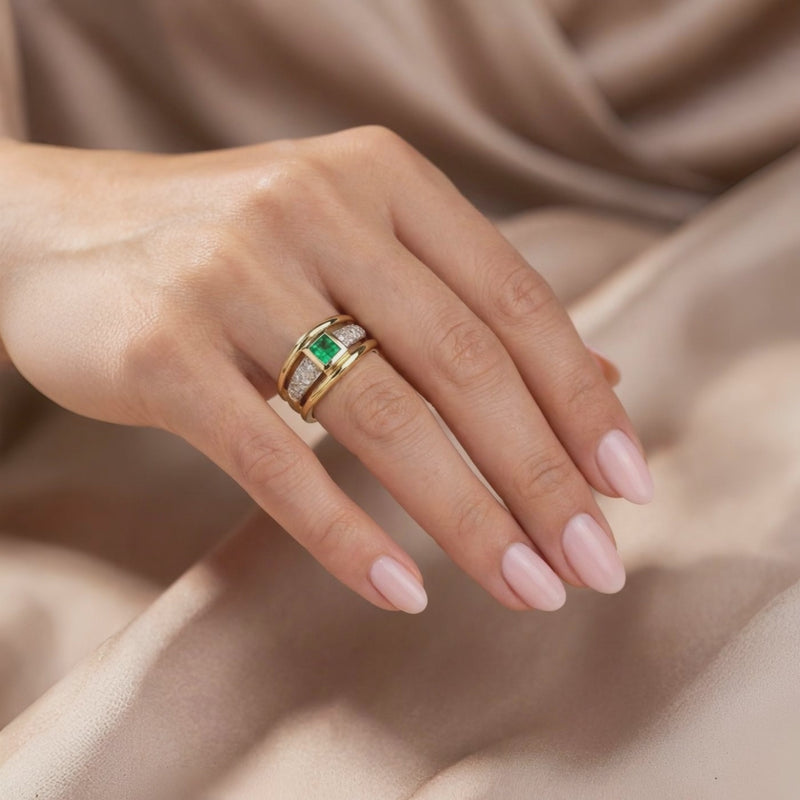 A striking pre-owned ring crafted in 9ct gold, featuring four square emeralds in a rub-setting as the centrepiece, flanked by pave-set diamonds in a graduated wide design. The combination of the vivid green emerald and sparkling diamonds creates a bold yet elegant statement piece, perfect for both everyday wear and special occasions.
