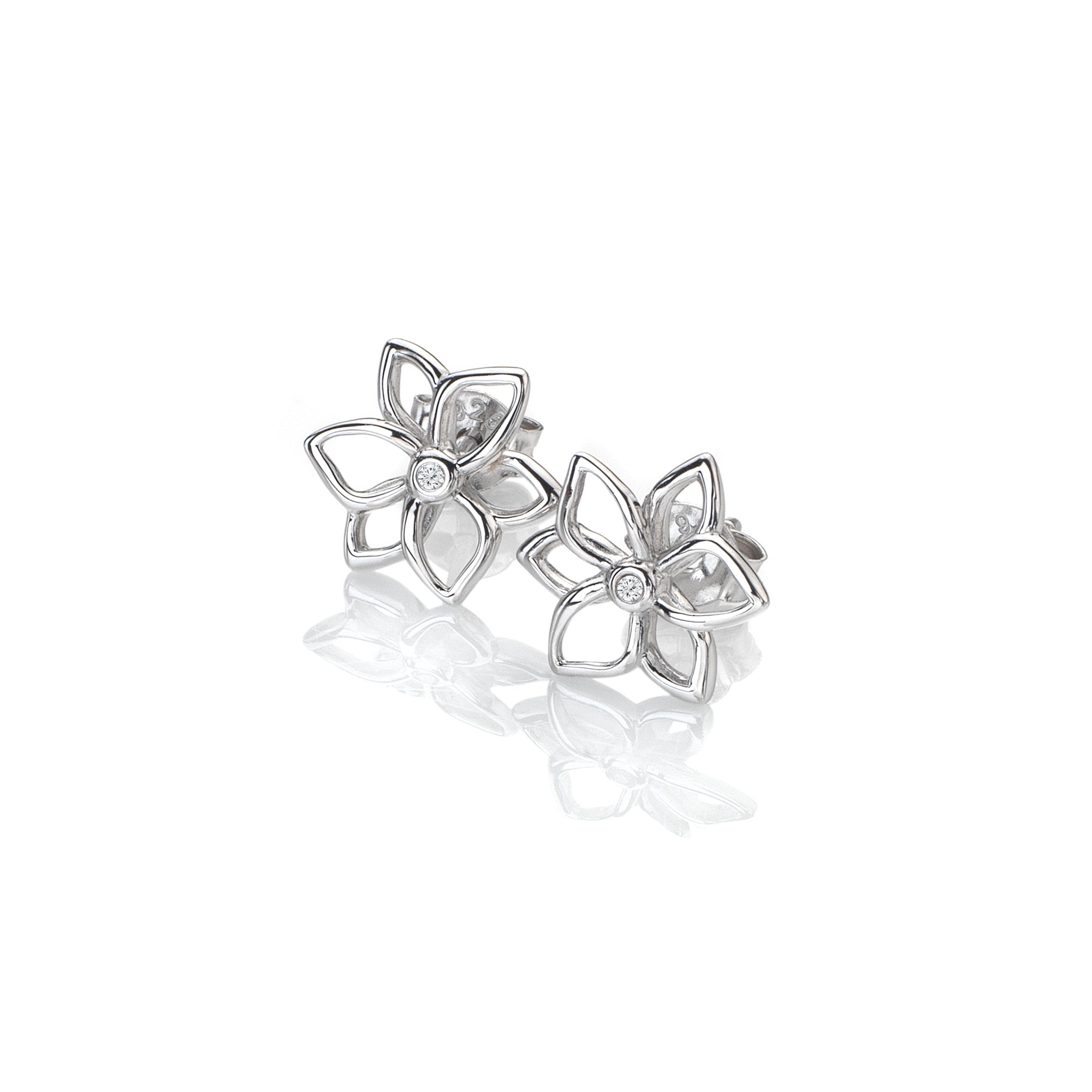 Simple and understated these 9mm x 9mm flower earrings are beautifully crafted in Sterling Silver and adorned with two real diamonds.