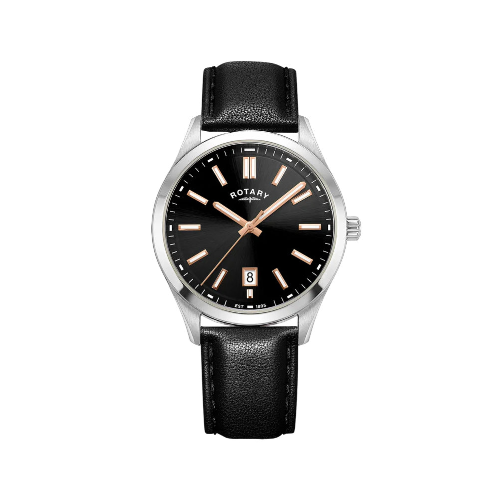 Bold, modern, and distinctly refined - the Rotary Heritage is a modern day classic built for everyday distinction. Featuring a 40mm stainless steel case and a striking black dial, this timepiece brings sophistication to any setting. Rose gold PVD baton hour markers and hands lend a warm contrast to the jet-black dial, offering excellent legibility and understated elegance. The date window at 6 adds practicality without disrupting the watch’s clean symmetry. Fitted with a textured black leather strap and powered by a reliable quartz movement, this Rotary Heritage is as dependable as it is stylish.