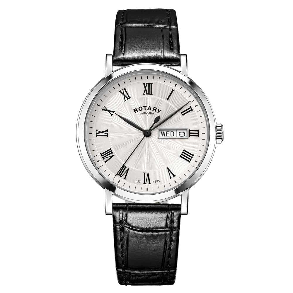 Expertly crafted with stainless steel and sapphire glass, this Rotary Heritage timepiece features applied Roman numeral markers over a white guilloche dial and outer minute track. A genuine black leather strap and water resistance of 50m ensures all day wearability. This classic watch is powered by a reliable quartz movement featuring a day/date complication for added practicality. The classic proportions of the 37mm case gives it an unimposing silhouette that quietly complements any look.