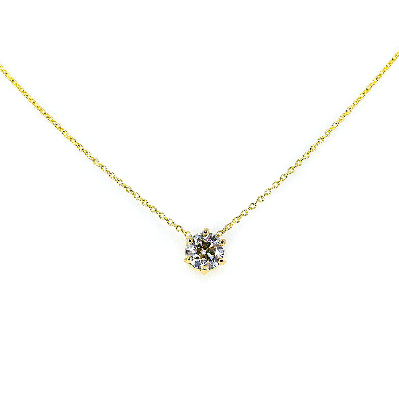 A Lab Grown Round Brilliant Cut Diamond 1.00ct solitaire set in a 18ct Yellow Gold six-claw setting, has been designed to float on a pretty trace chain, as the chain glides through the back of the pendant setting.