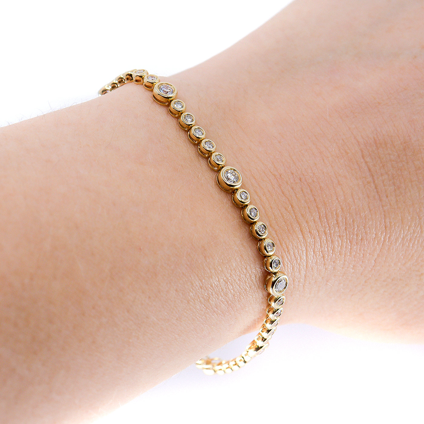 This elegant 9ct Yellow Gold Diamond bracelet is a perfect choice for anyone who loves jewellery. This timeless design features round brilliant cut Diamonds, each nestled inside a smooth, rub over setting, which gives the finished piece a fresh, contemporary edge.