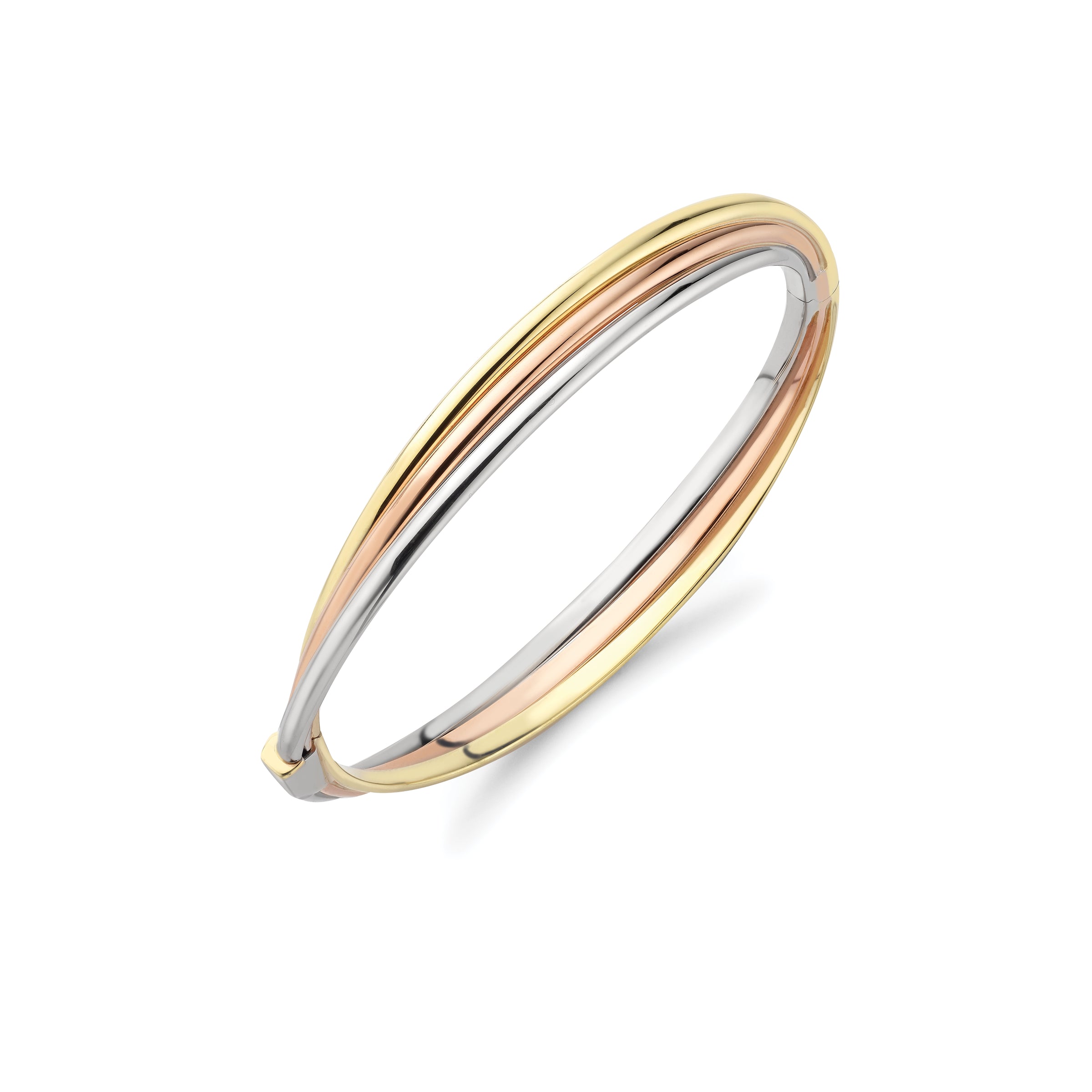 An elegant bangle that is a symmetrical interpretation of the 'Russian' bangle, crafted in 9ct Rose, White and Yellow Gold where the different tubes remain in fixed order. This easy to wear hinged bangle has a tongue and groove clasp.