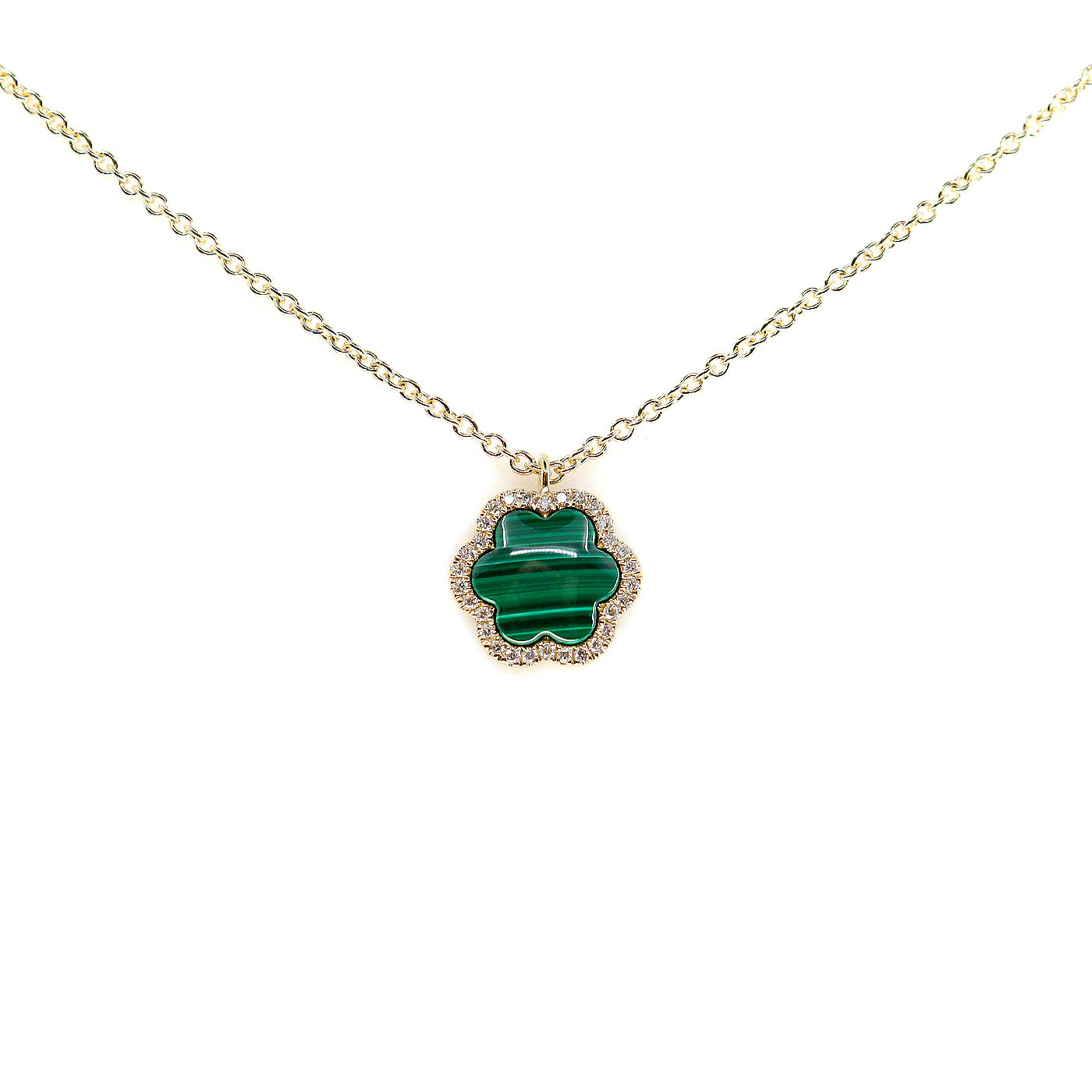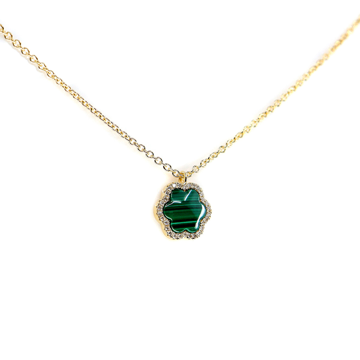 Pretty petal design pendant, with a central Malachite gemstone surrounded by a halo of sparkling Diamonds. The deep green tone of the malachite is complimented by a 9ct Gold setting with a pretty trace chain with an adjustable length of 16"-18". Complete the set with the matching stud earrings and ring.