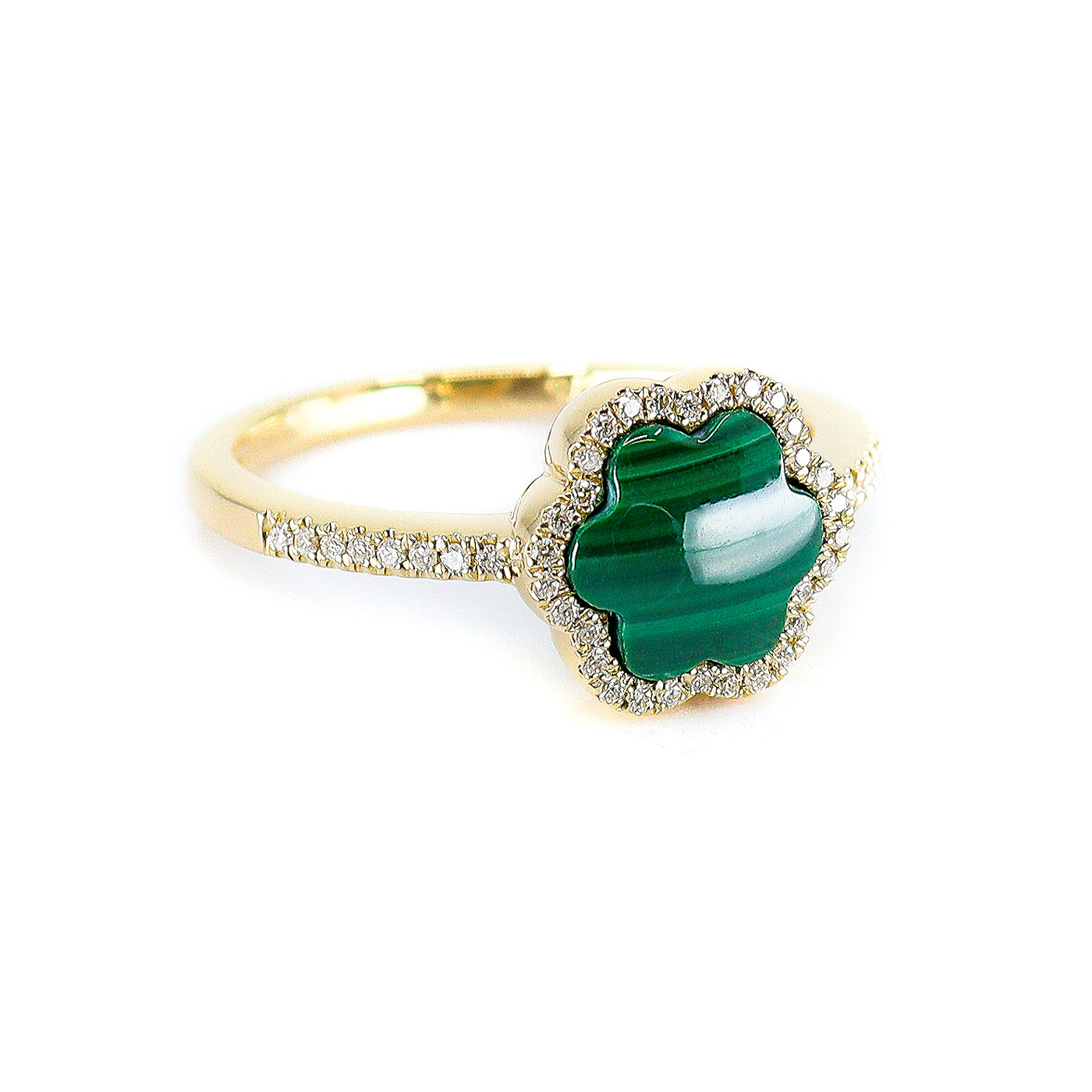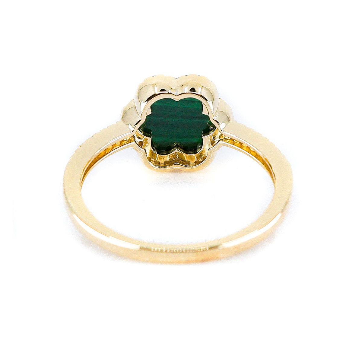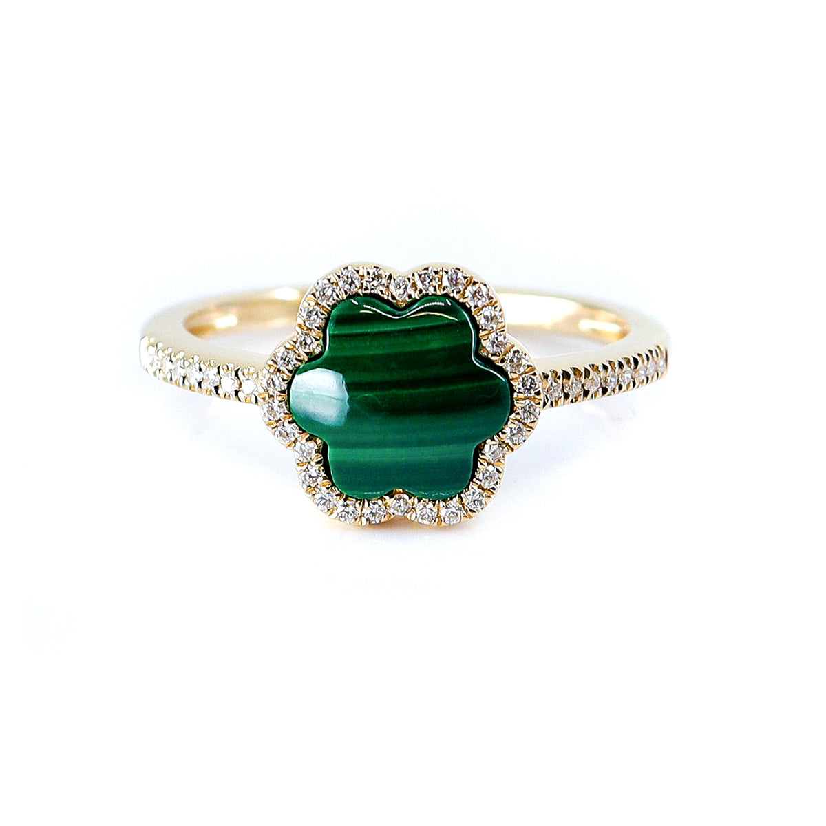 Pretty petal design ring, with a central Malachite gemstone surrounded by a halo of sparkling Diamonds. The deep green tone of the Malachite is complimented by a 9ct Gold setting. Complete the set with the matching pendant and stud earrings.