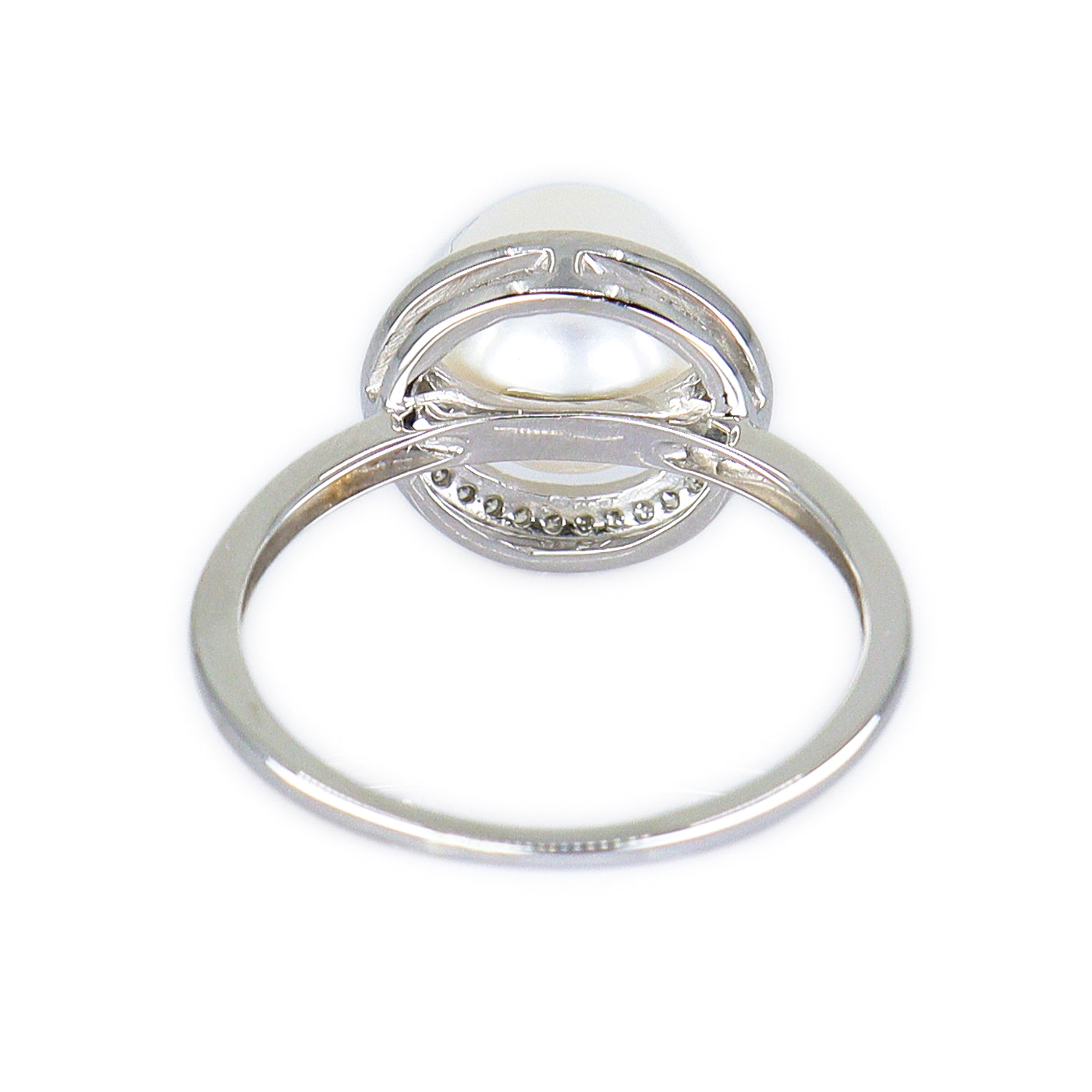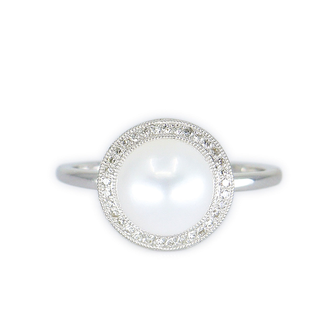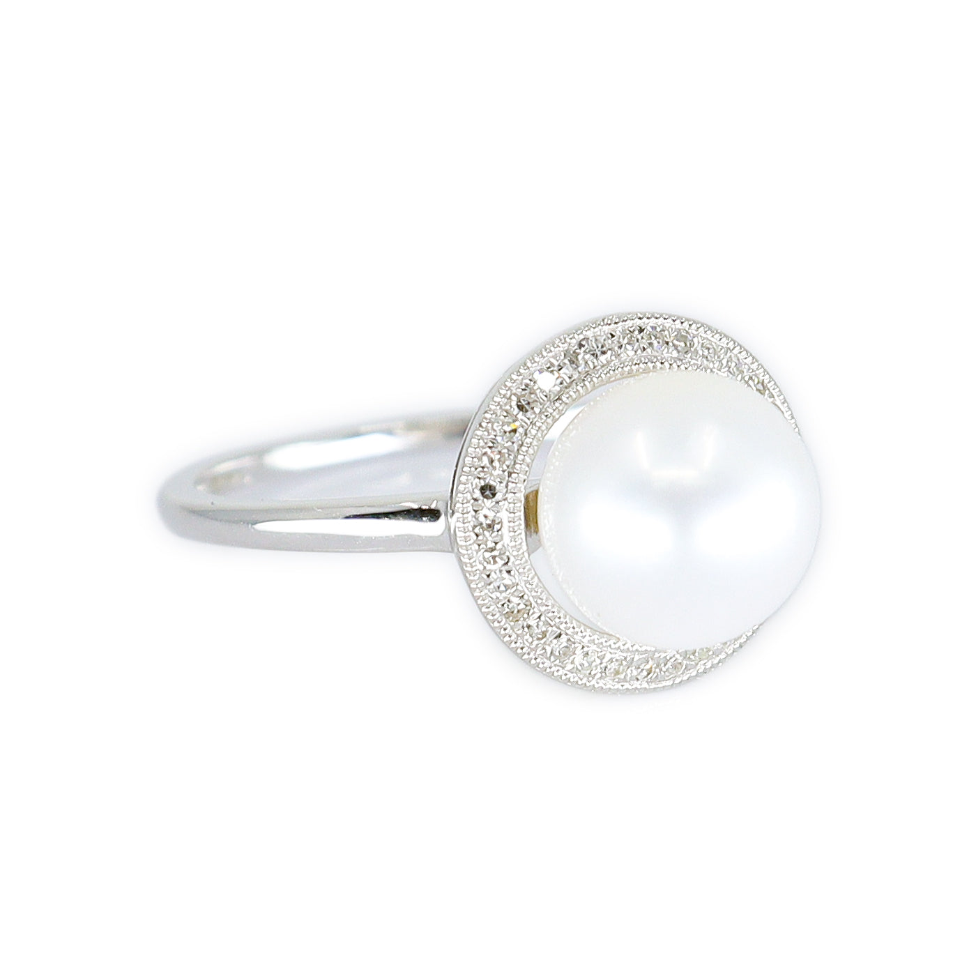 An elegant 9ct White Gold ring featuring a lustrous round Freshwater Pearl at its centre, beautifully framed by a sparkling halo of round brilliant cut Diamonds. The Diamonds are set with delicate millgrain edging, adding a vintage-inspired touch and enhancing the ring’s intricate detail.