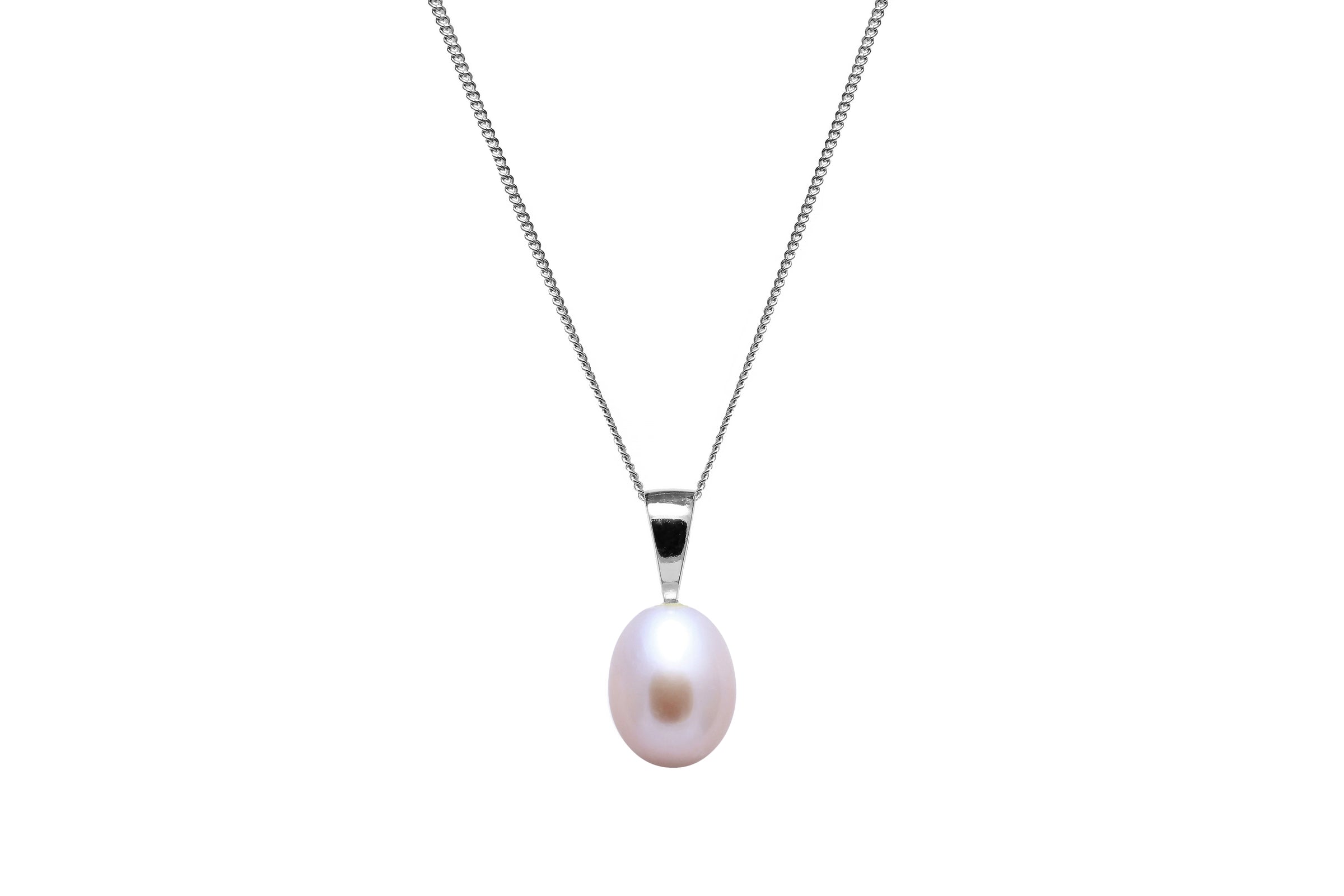 Elegant and timeless, this pendant showcases a lustrous Freshwater Pink Pearl in a smooth teardrop shape, measuring 7.5–8mm. the pearl is delicately set on a sleek 9ct White Gold mount, suspended from a pretty 9ct White Gold curb chain for a refined finish.