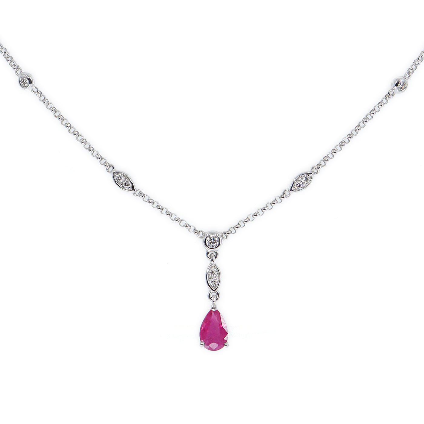 A stunning 9ct White Gold drop necklace featuring a pear-shaped Ruby held in a classic claw setting. The pendant is beautifully accented with round brilliant cut Diamonds, each set in an elegant round rub setting or marquise grain-setting, creating stations along the pretty trace chain.