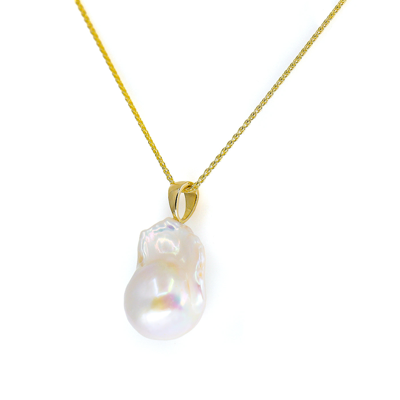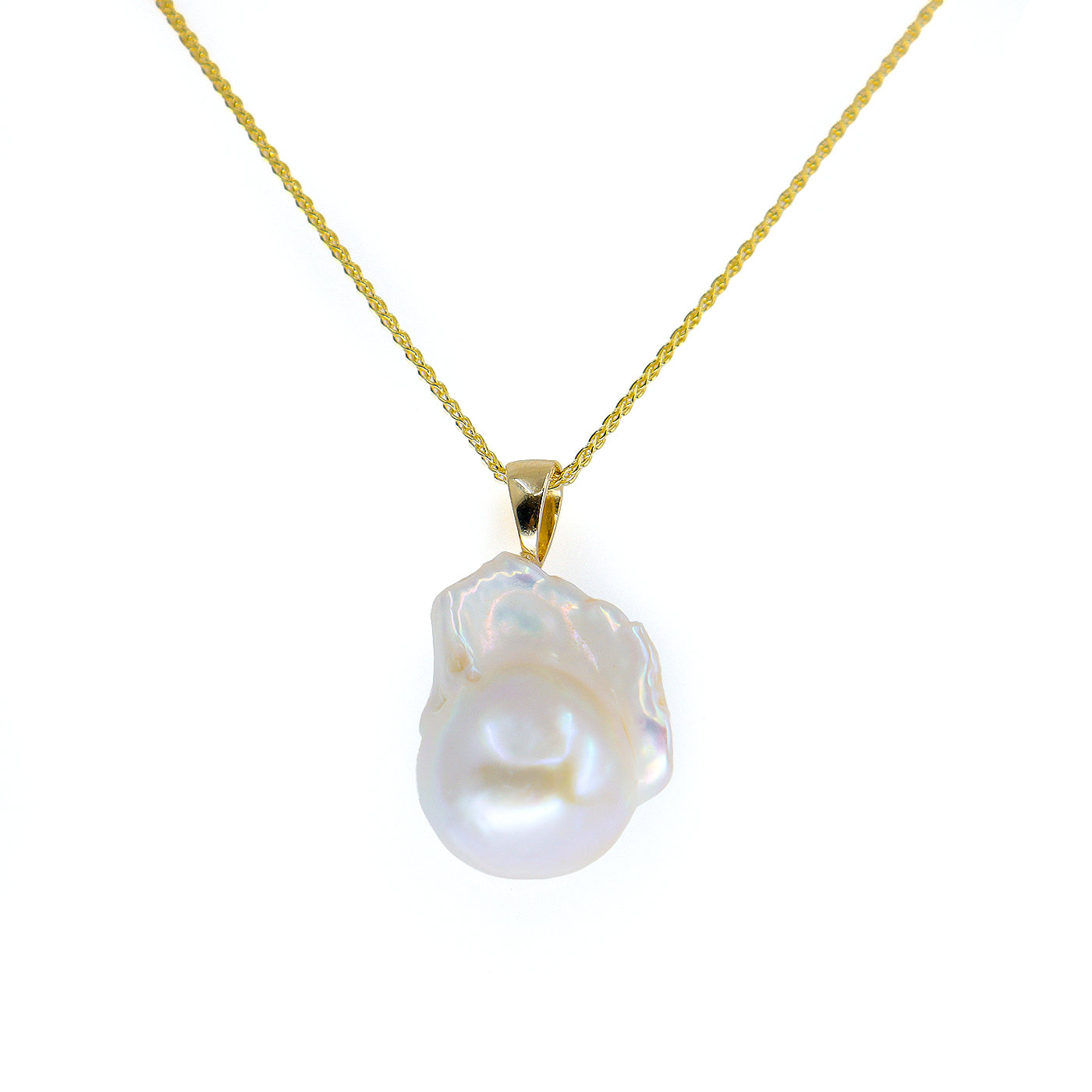 Make a statement with this large Freshwater Baroque White Pearl, approximately 24 × 17.5mm, a unique natural shape and lustre. The pearl is beautifully suspended from a polished 9ct Yellow Gold bale and paired with a classic 18" 9ct Yellow Gold curb chain for effortless elegance.