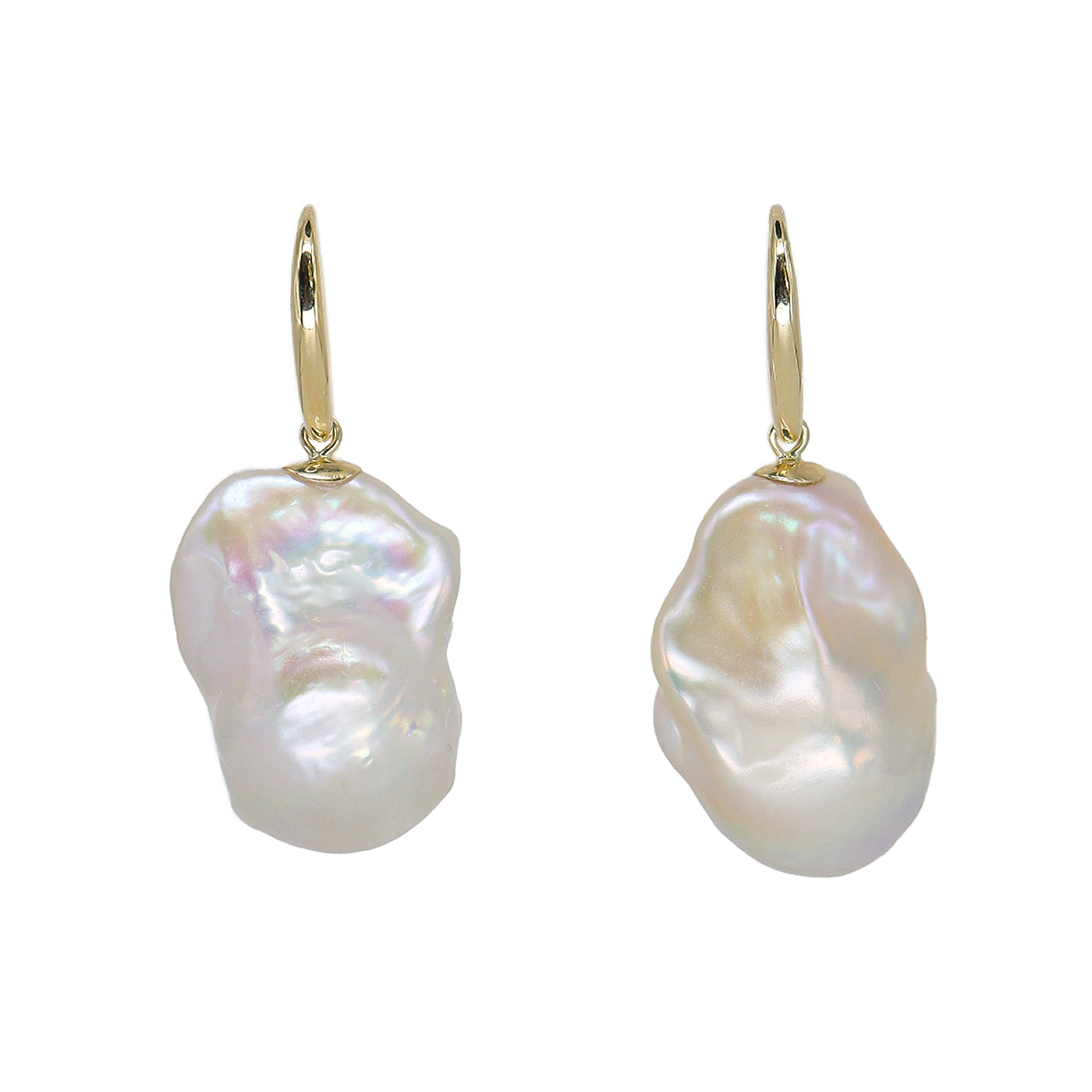 A statement and luxurious, these drop earrings showcase a pair of impressive large Freshwater Baroque Pearls, each measuring approximately 22.5 × 16mm. Their organic shapes and high lustre make every pair truly unique. The pearls are suspended from polished 9ct Yellow Gold fittings, creating an elegant balance of natural beauty and refined craftsmanship.