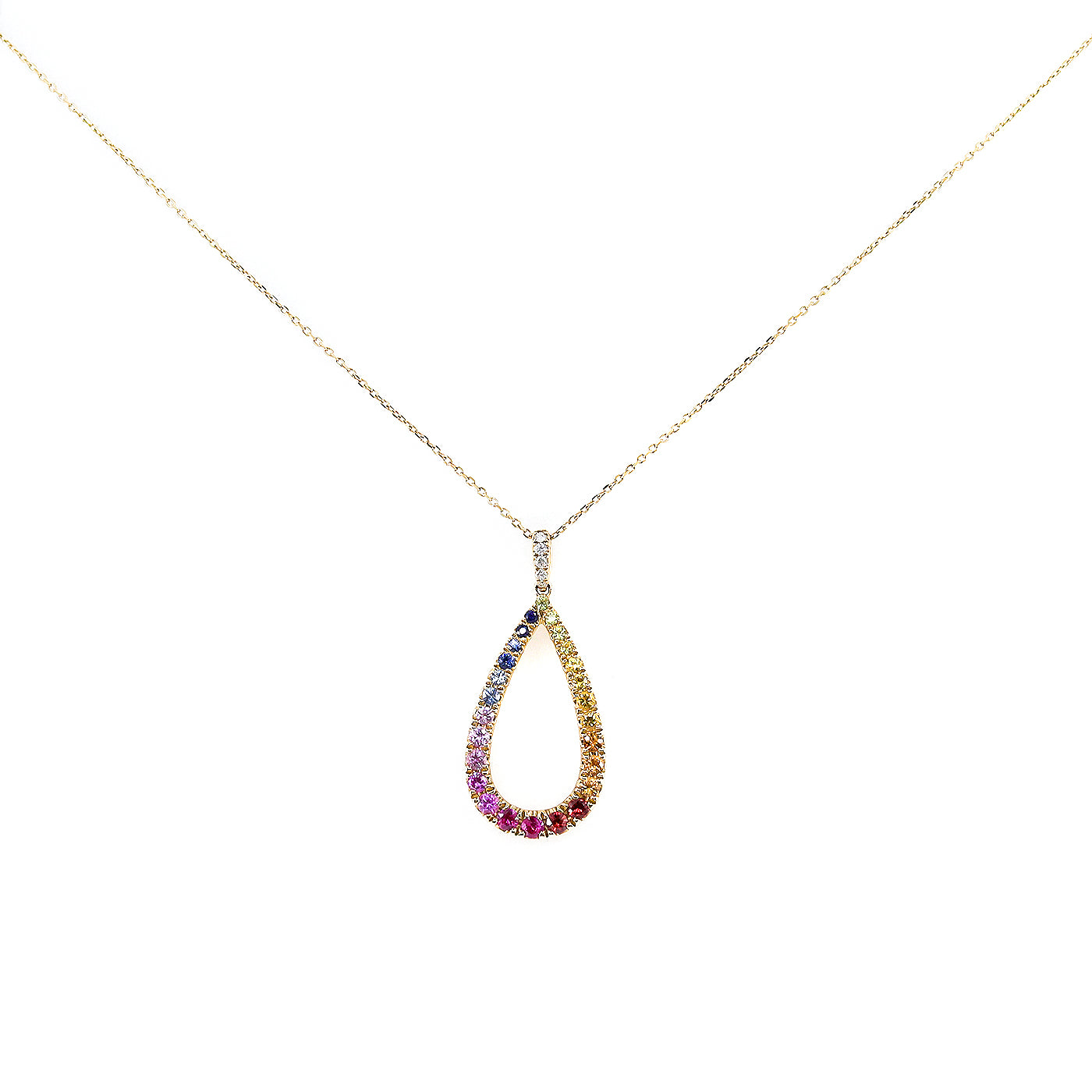 Add a touch of color and elegance to any look with this stunning rainbow sapphire teardrop pendant. Featuring a graceful open teardrop silhouette, this pendant is adorned with a seamless gradient of round sapphires in a deep blue and violet to fiery red and sunny yellow. Set in polished 9ct Yellow Gold and suspended from a delicate matching chain, this piece is a joyful celebration of color, light, and individuality.