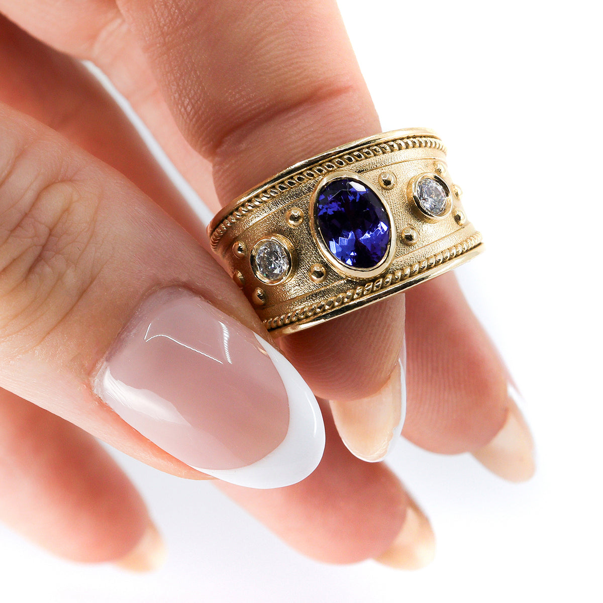 This exquisite 9ct yellow gold statement ring showcases a stunning oval faceted tanzanite as its centrepiece. The rich gemstone is beautifully complemented by two round brilliant-cut diamonds, accentuated with intricate gold bead detailing. Finished with a signature twist wire edge and a textured background, this remarkable ring is a timeless blend of excellent craftsmanship and sophistication.