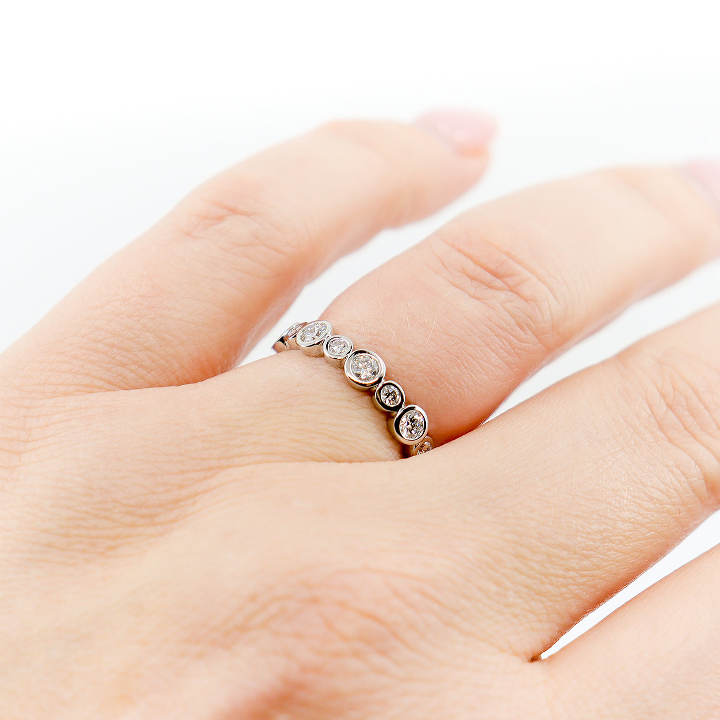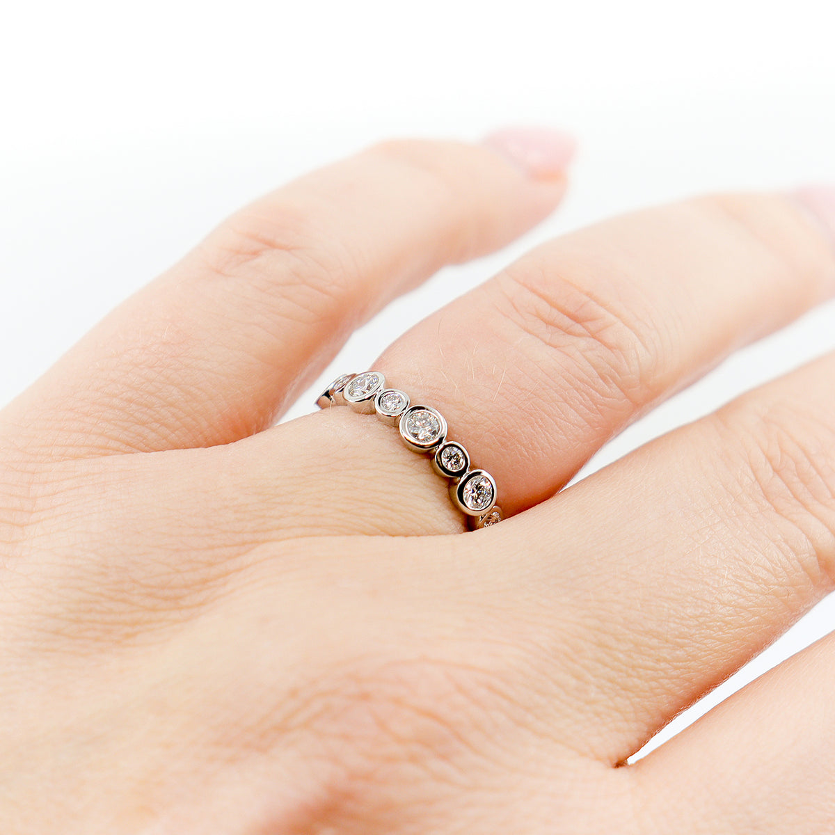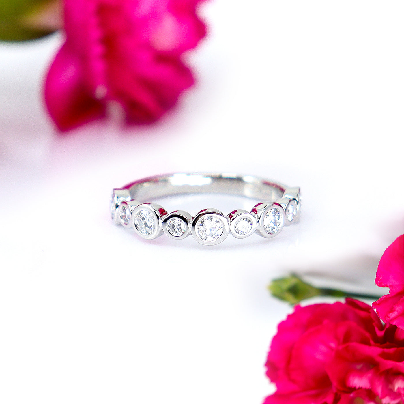 A fresh and youthful design was created using Platinum and Lab Grown Diamonds for this half eternity ring. A rub setting was selected to enhance the cut and alternate sizes of the Lab Grown Diamonds. Set in a highly polished mount, this ring gifted to celebrate a special birthday will be enjoyed for many years to come.