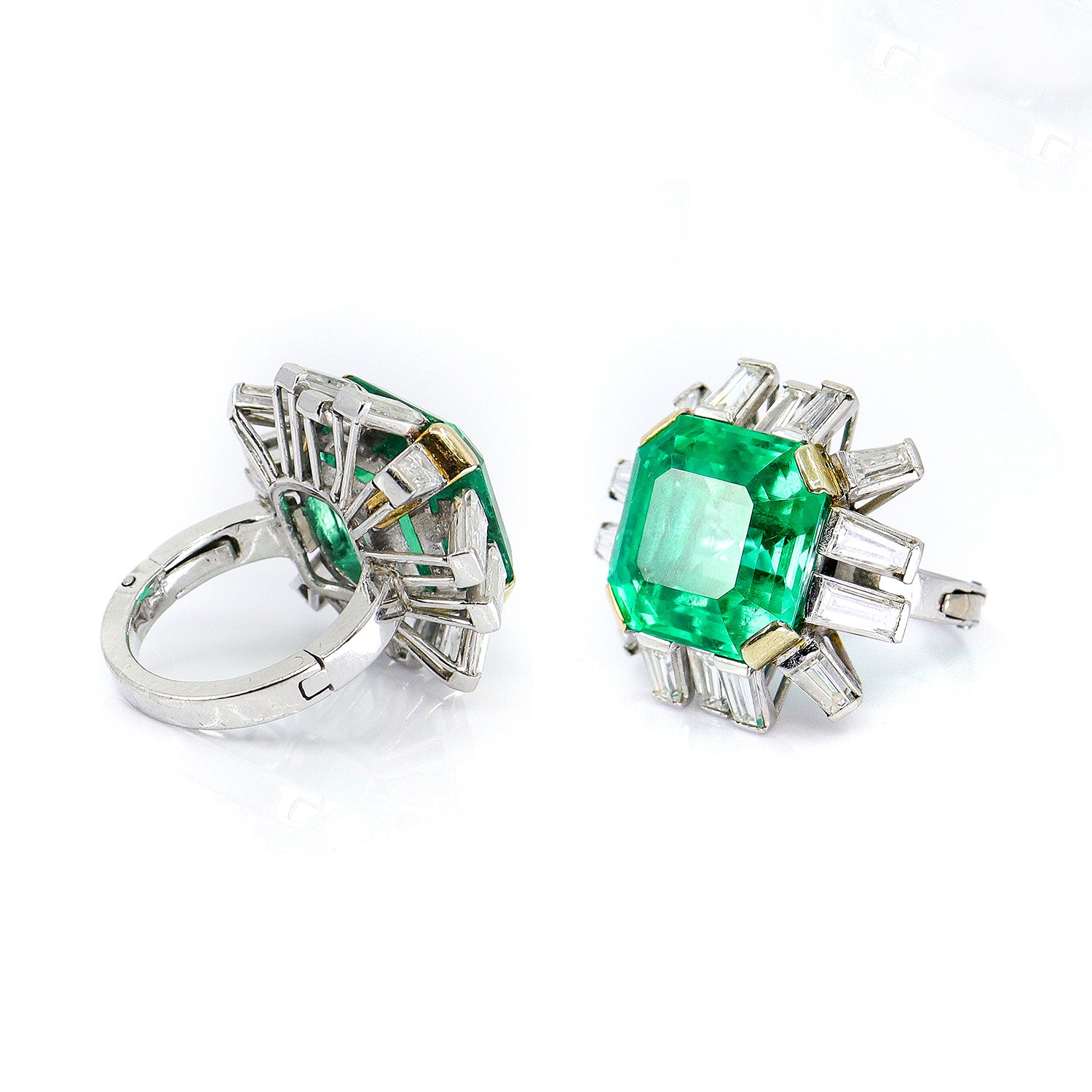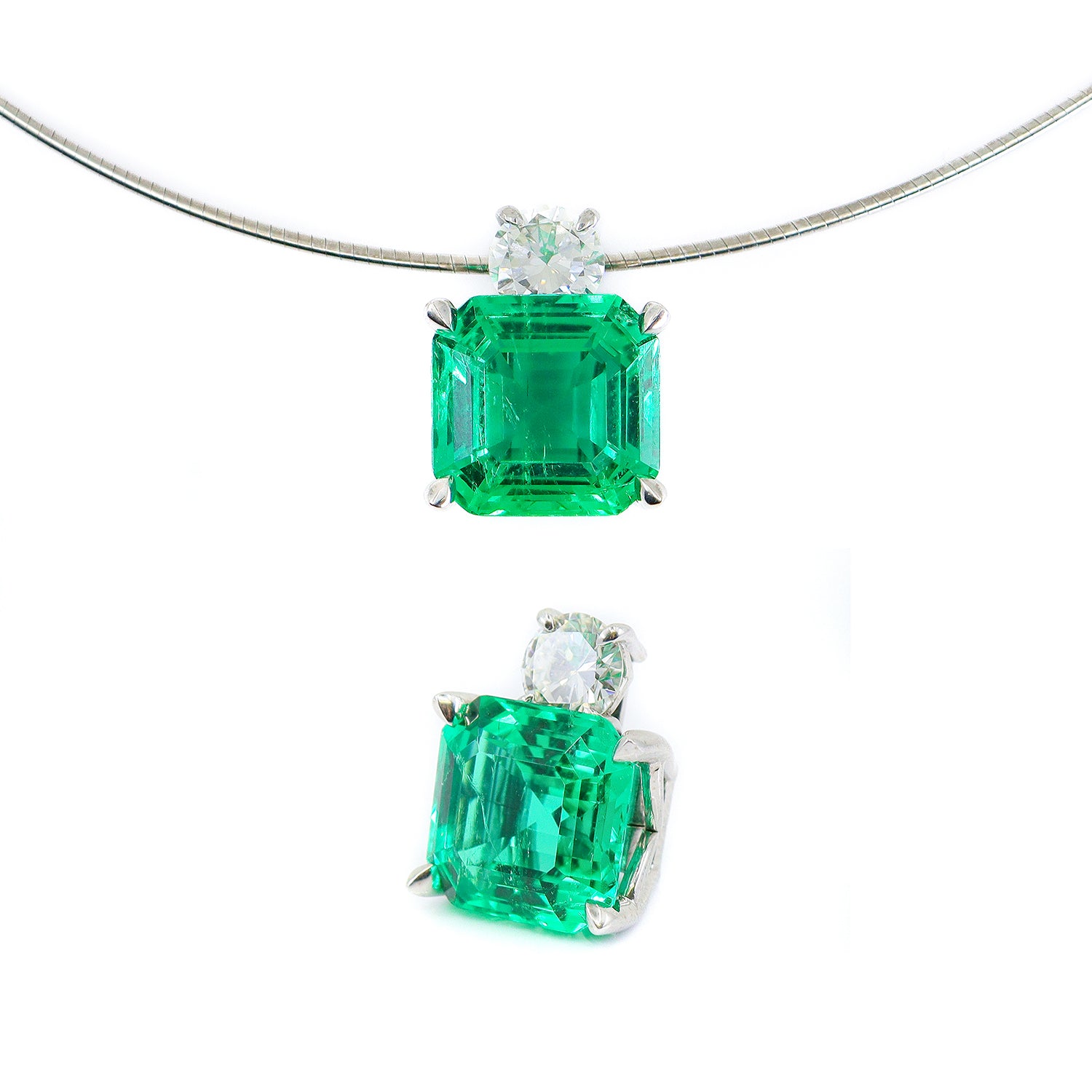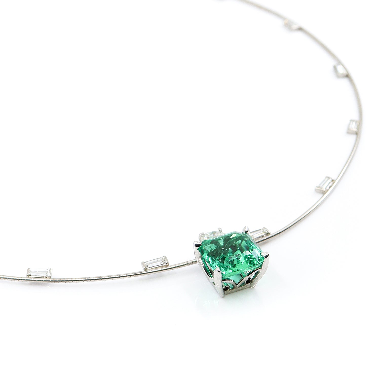 contemporary piece. Of course, this one-of-a-kind emerald takes centre stage, but we elevated the design by creating a pendant with an interchangeable omega chain. One in highly polished platinum and another, also in platinum featuring the tapered cut diamonds from the ring. A diamond bail was added to complete the design. Now, this emerald is ready to continue its journey for generations to come.