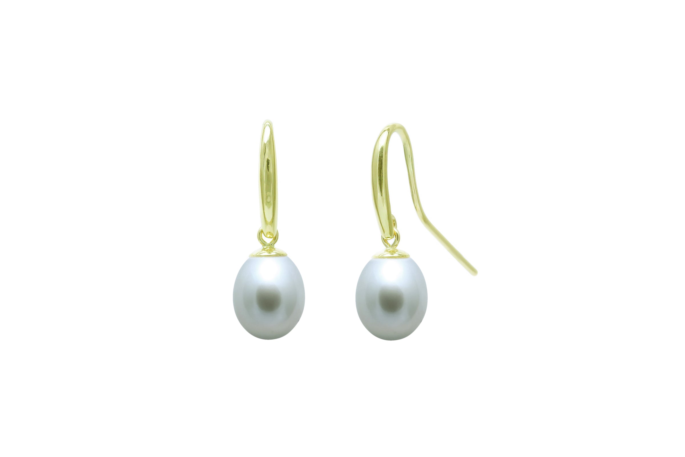 A classic Pearl drop with a contemporary twist. Set in 9ct Yellow Gold with a pretty silver grey teardrop Freshwater Pearl swings from a hookwire fitting that has a fluid and modern design.