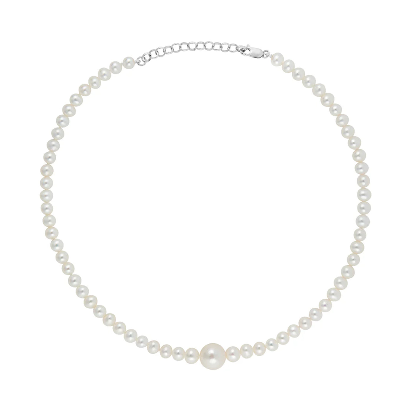 A statement white Freshwater Pearl necklace strung with 8mm sized pearls and finished with a striking oversized central pearl giving this classic row a modern look.