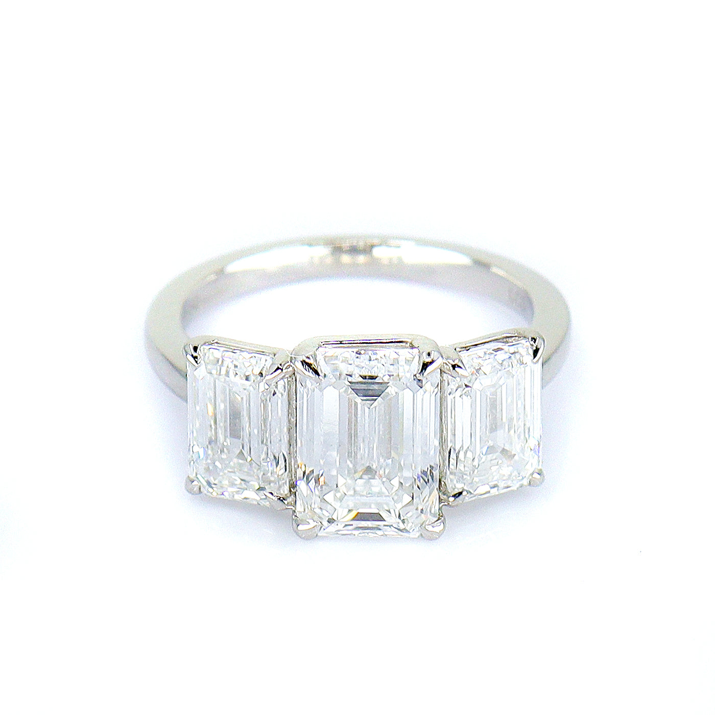 A Lab Grown Emerald Cut Diamond Trilogy Ring totalling 5.31ct crafted in Platinum with a tapered claw setting, has been designed to sit next to a plain or diamond set wedding band. This ring features beautiful scalloped under bezels, adding feminine flair to this design.