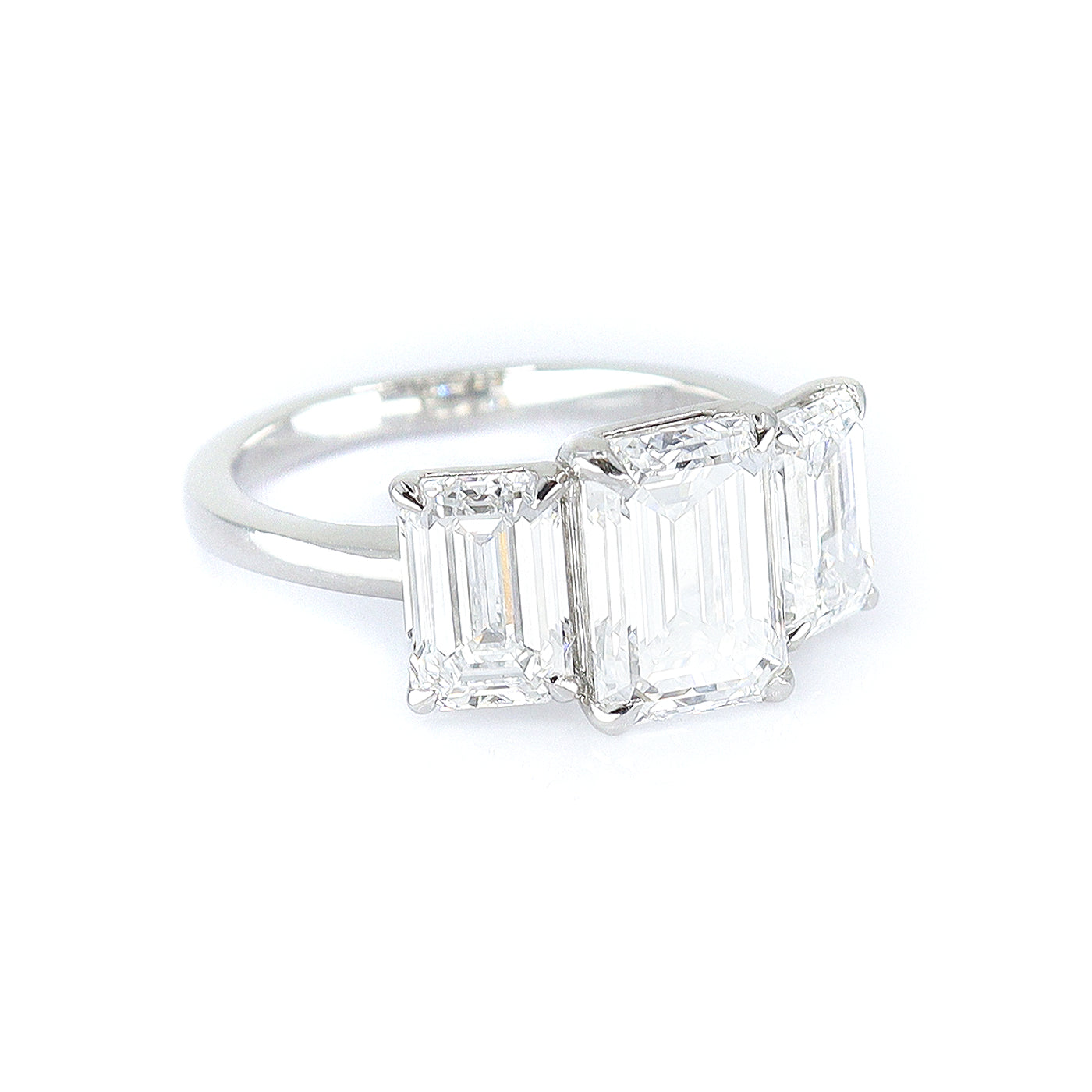 Platinum 5.31ct Lab Grown Certificated Emerald Cut Diamond Trilogy Ring