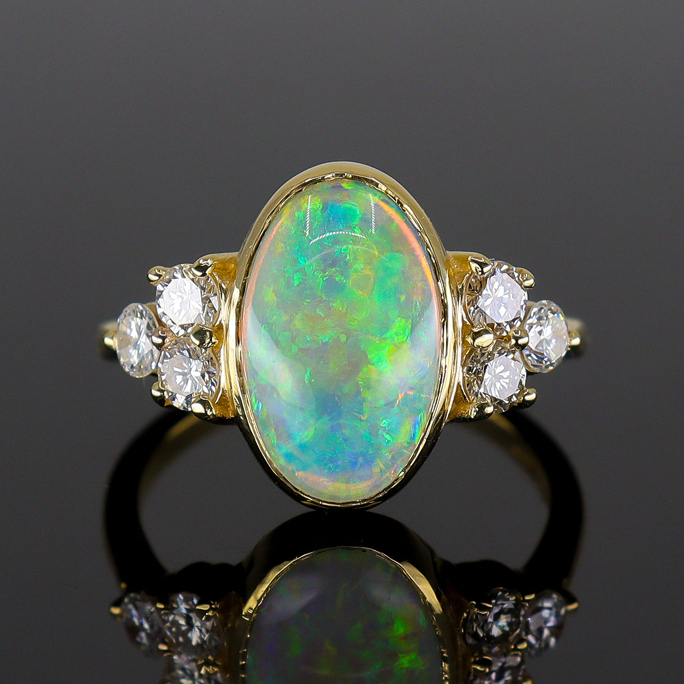 Pre-Owned 18ct Gold Rub Set Oval Opal & Claw Set Round Brilliant Cut Diamond Trefoil Shoulder Ring Metal - 18ct Yellow Gold Gemstone - Opal Cut - Oval Cabochon Carat - 2.20ct Accent Diamonds Cut - Round Brilliant Carat - 0.66ct Approximate Total Weight Colour - H/I Clarity - SI1-2 Setting - Rubover & Claw
